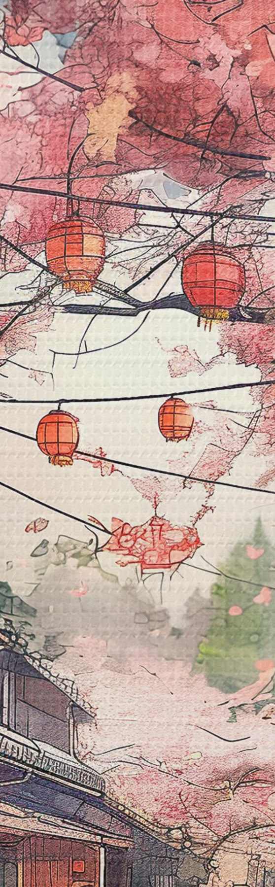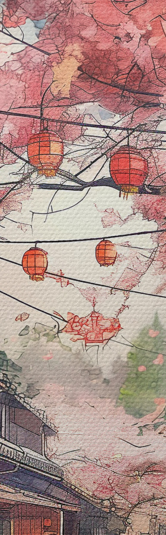Obraz Japonská ulice s kvetoucími třešněmi, orientální architektura, lucerny Č. s39774