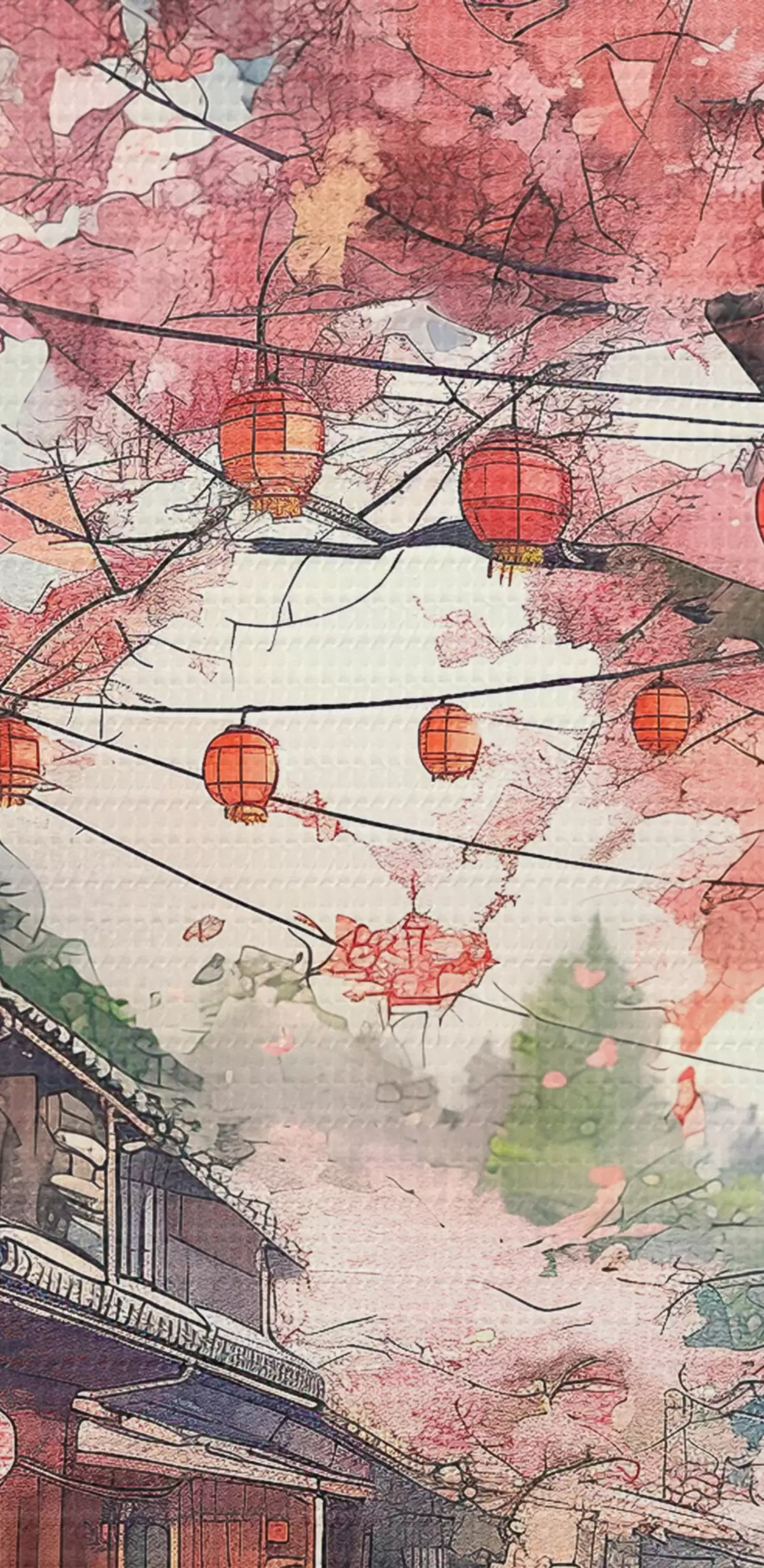 Obraz Japonská ulice s kvetoucími třešněmi, orientální architektura, lucerny Č. s39774
