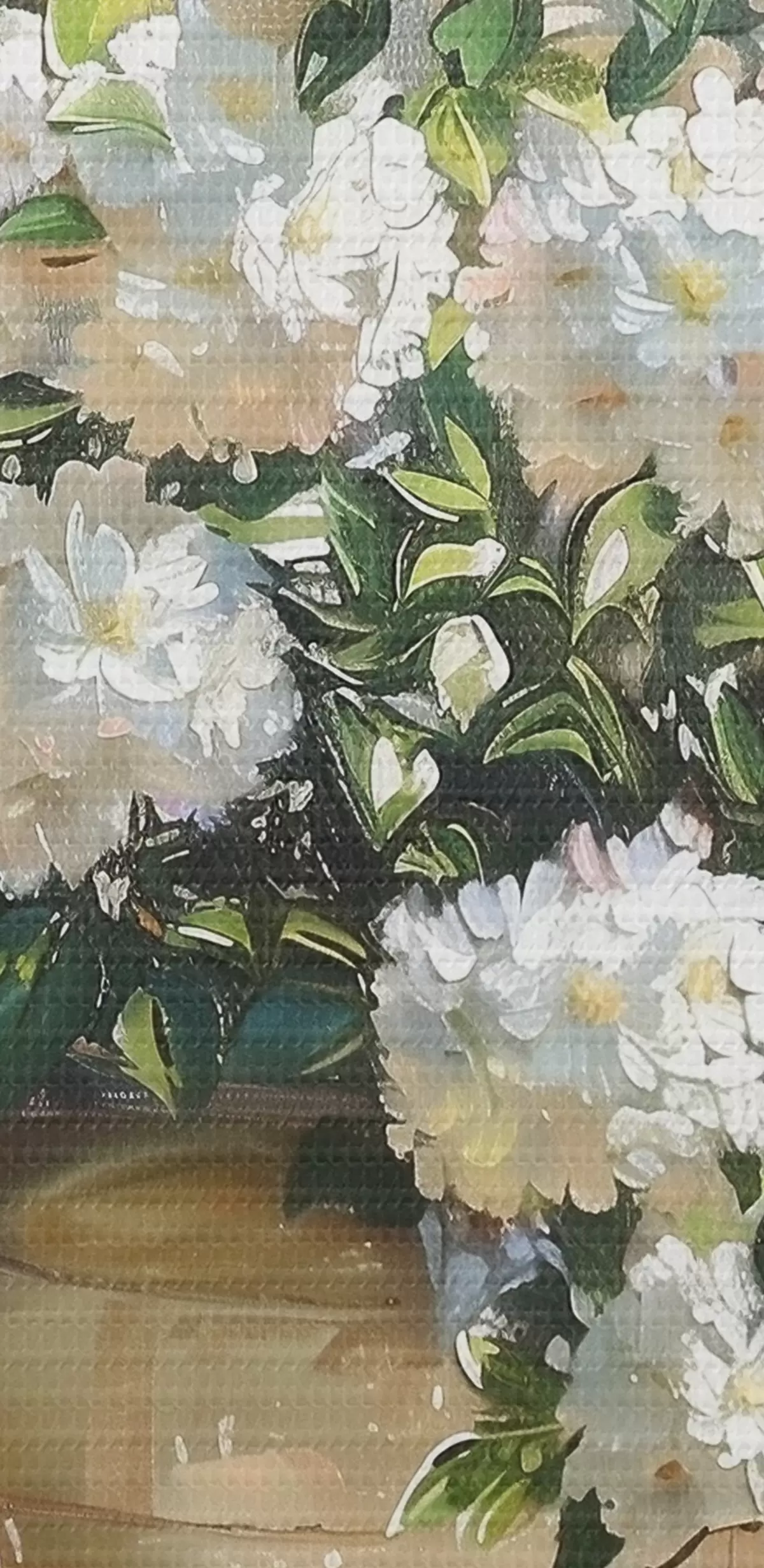 Obraz Bílé hortenzie ve váze, sluneční světlo v okně, olejomalba Č. s39779