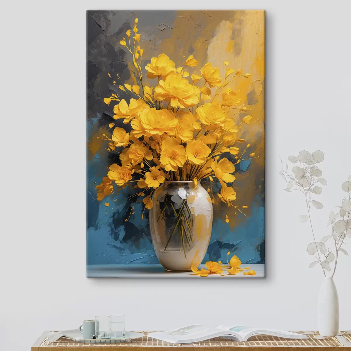 Obraz Žluté květy ve váze na vícebarevném akrylovém pozadí Č. s39854