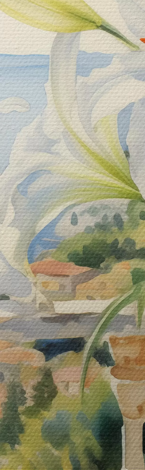 Obraz Bílé lilie v květináči na balkóně na pozadí akvarelu zálivu Č. s39932