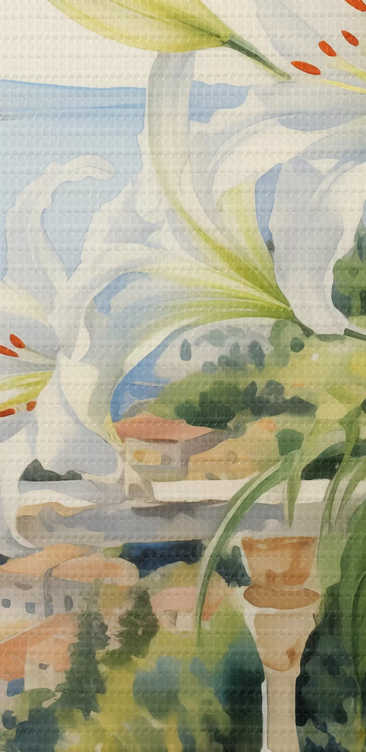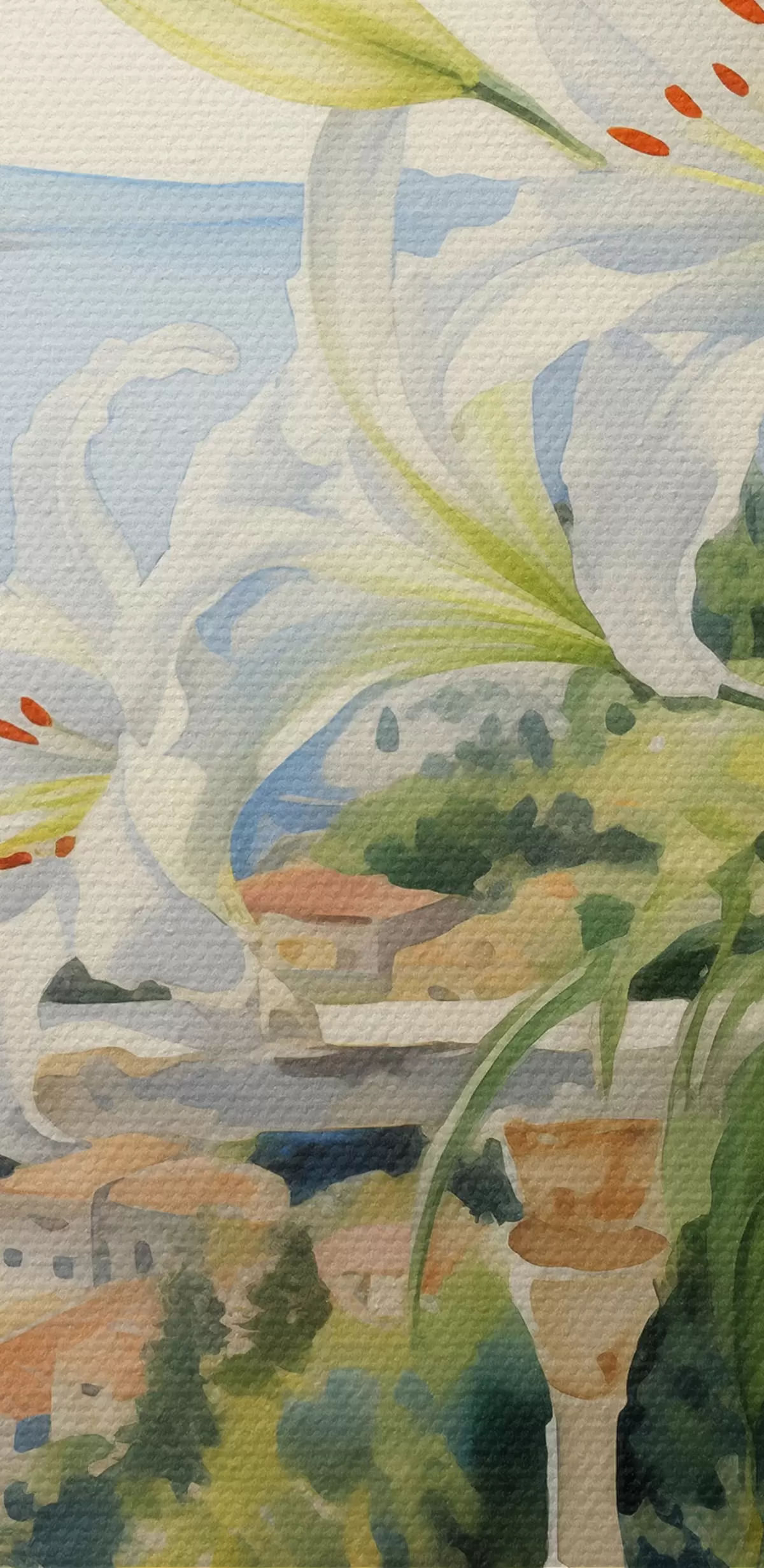 Obraz Bílé lilie v květináči na balkóně na pozadí akvarelu zálivu Č. s39932