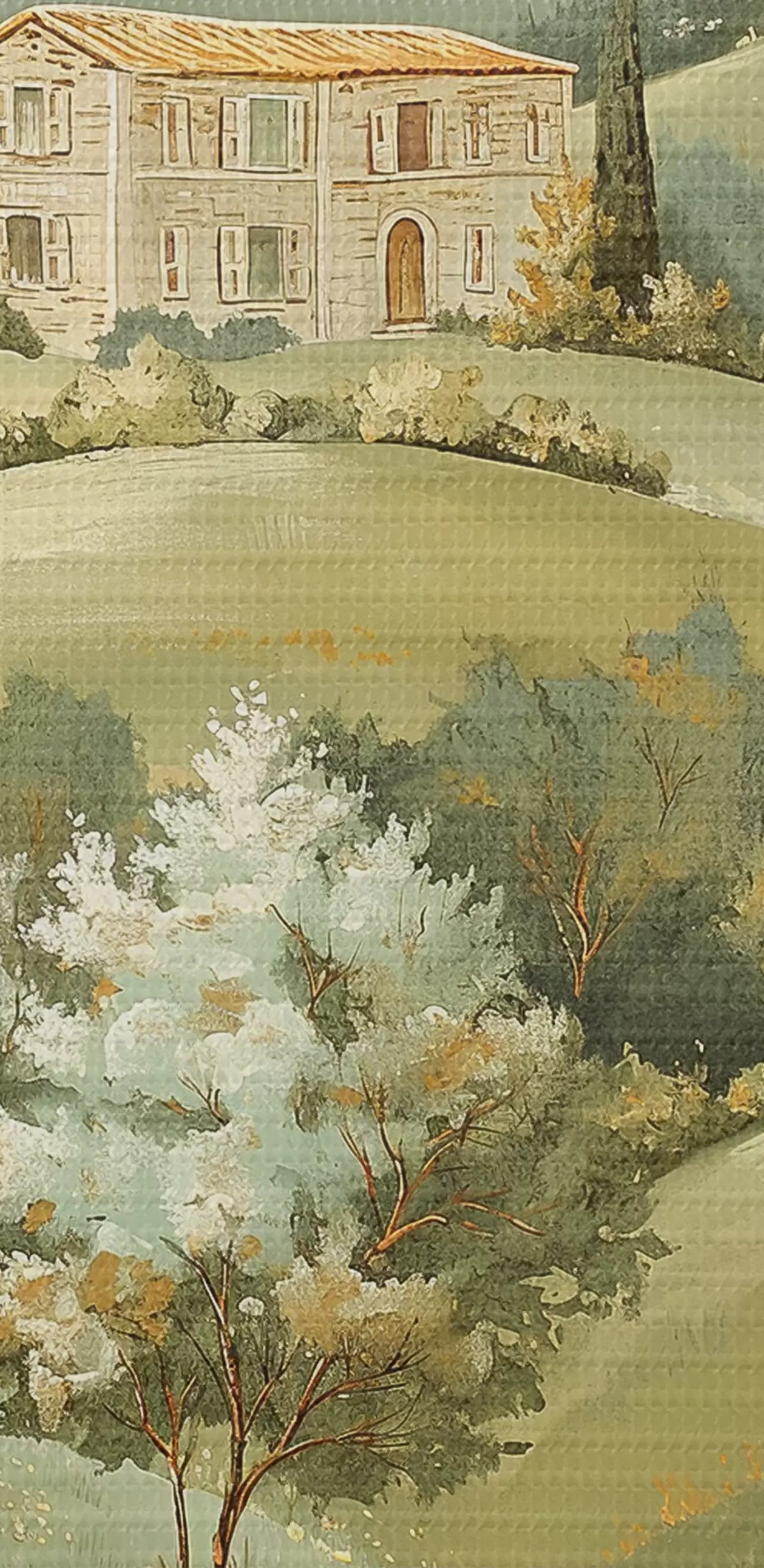 Obraz Krajina s vintage domy, pastelově zelené barvy, akrylová kresba, léto Č. s40078