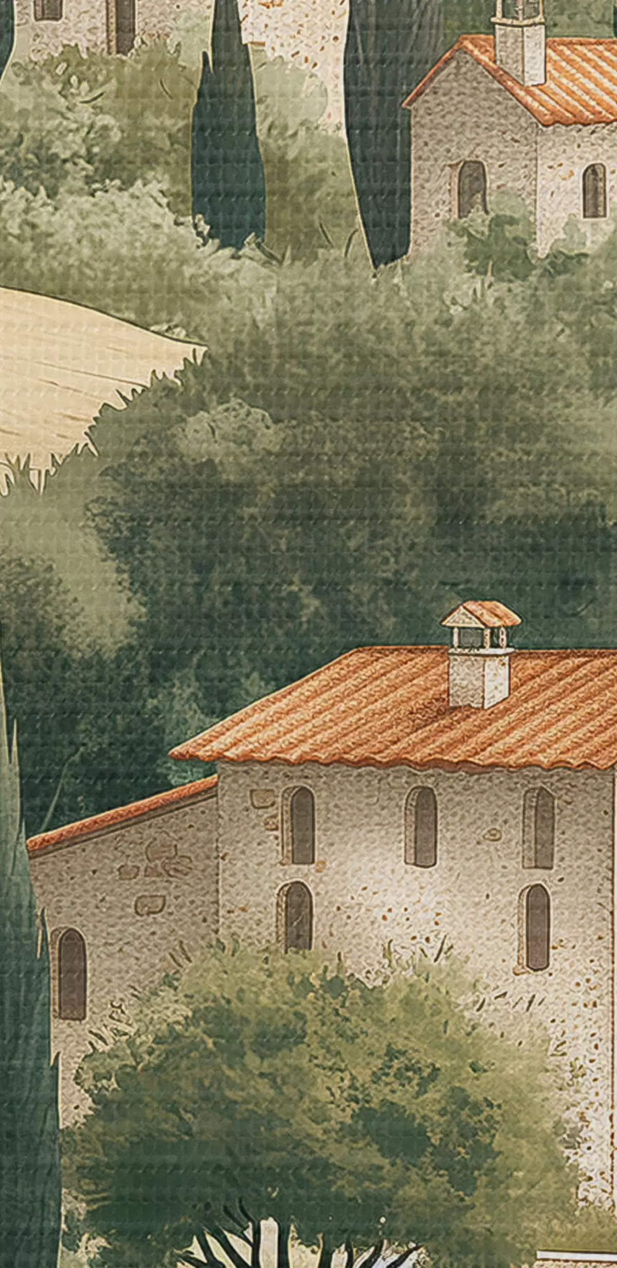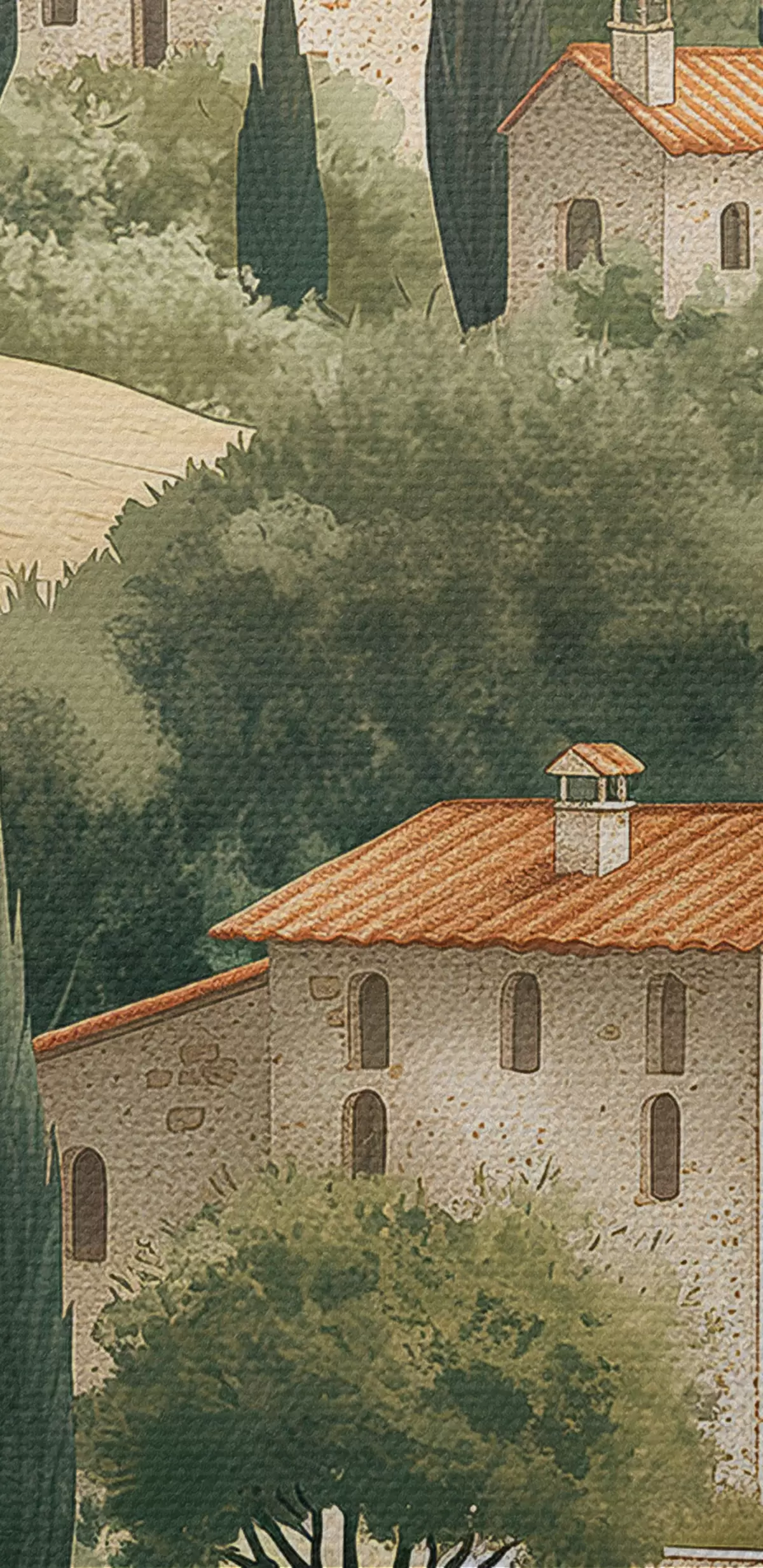 Obraz Toskánská krajina s vintage domy, pastelové barvy, kopce a stromy, rustikální Č. s40082