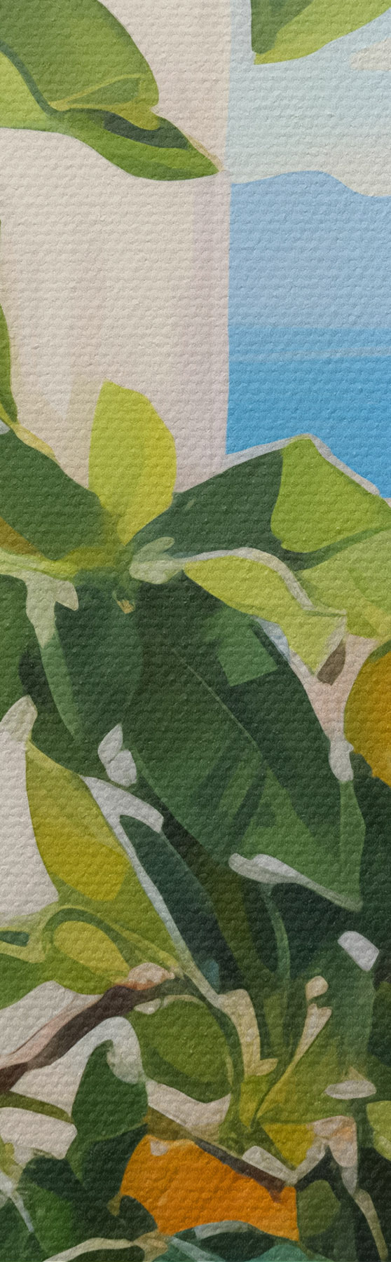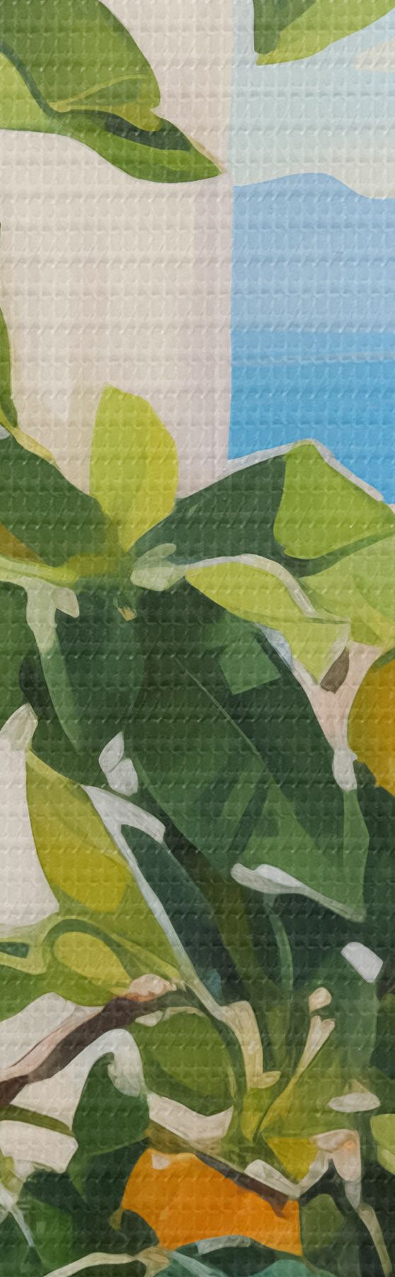 Obraz Citrony na stromě a stole na hotelovém balkóně s imitací olejomalby s výhledem na moře Č. s40091