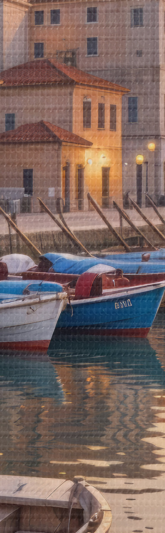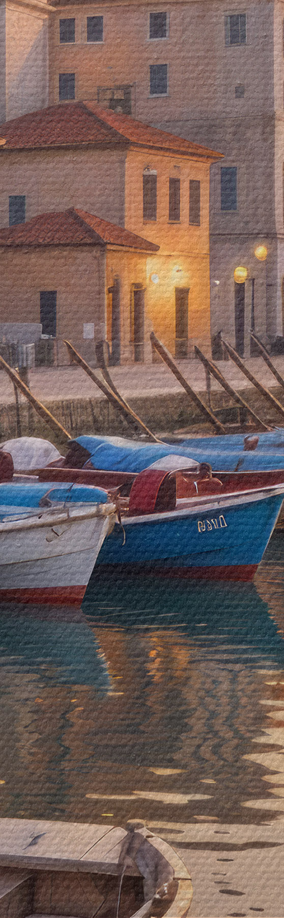 Obraz Italské pobřežní město při západu slunce s barevnými budovami lemujícími nábřeží a čluny plujícími v klidných vodách Č. s40150