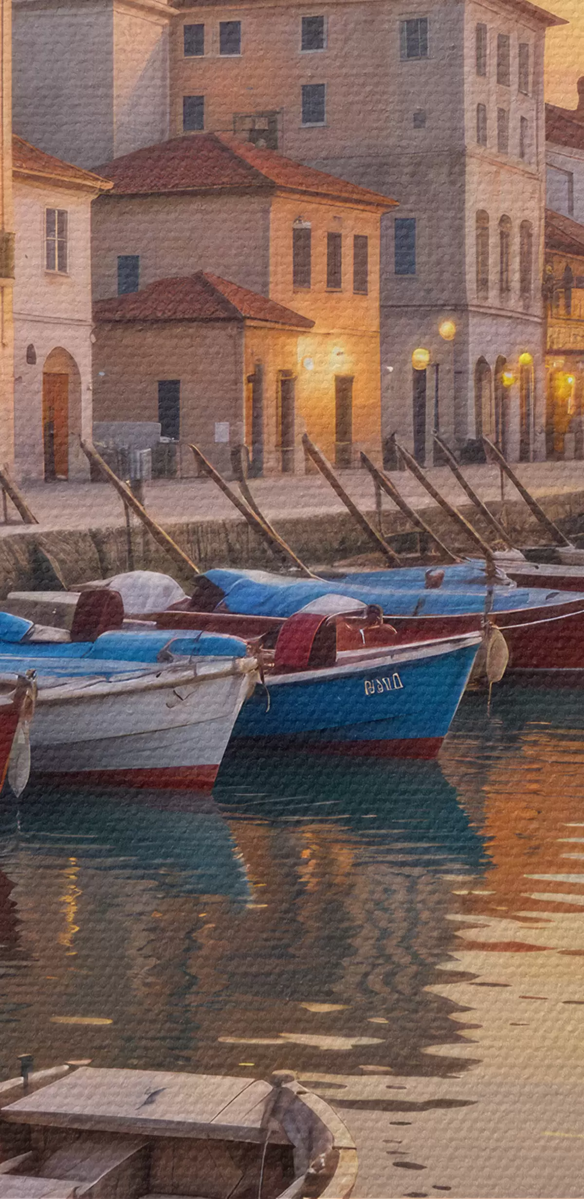 Obraz Italské pobřežní město při západu slunce s barevnými budovami lemujícími nábřeží a čluny plujícími v klidných vodách Č. s40150