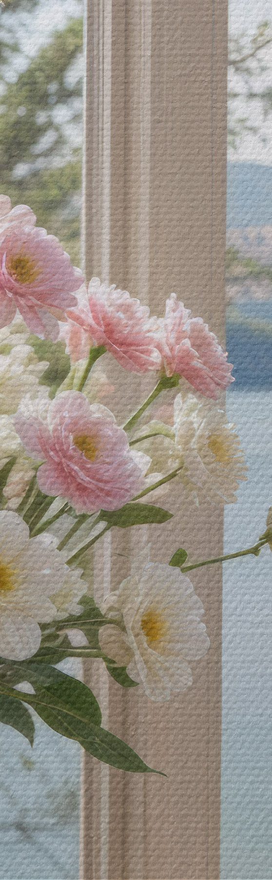 Obraz Kytice růžových a bílých květin ve skleněné váze umístěné na okenním parapetu s malebným jezerem a horami Č. s40151