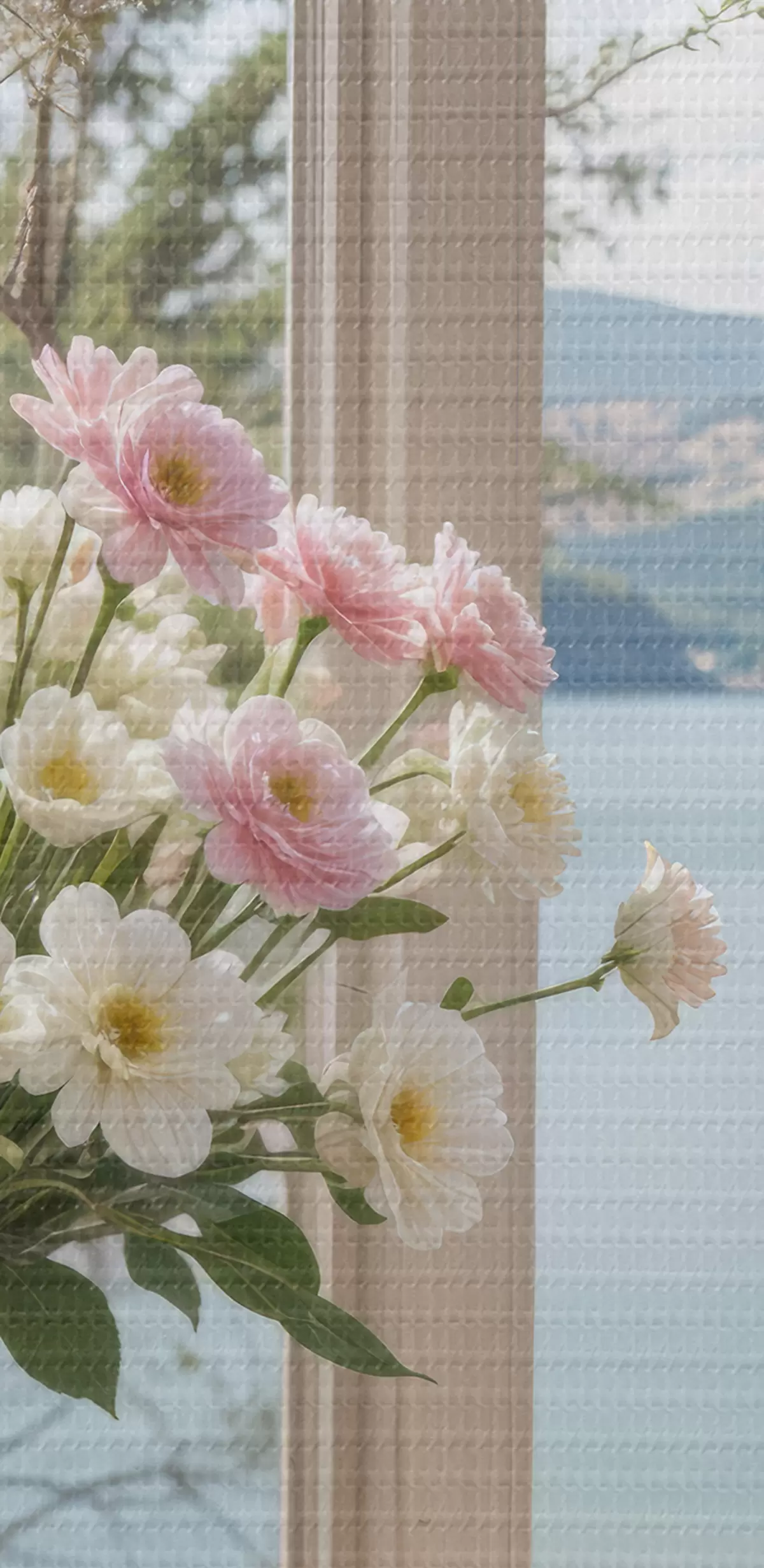 Obraz Kytice růžových a bílých květin ve skleněné váze umístěné na okenním parapetu s malebným jezerem a horami Č. s40151