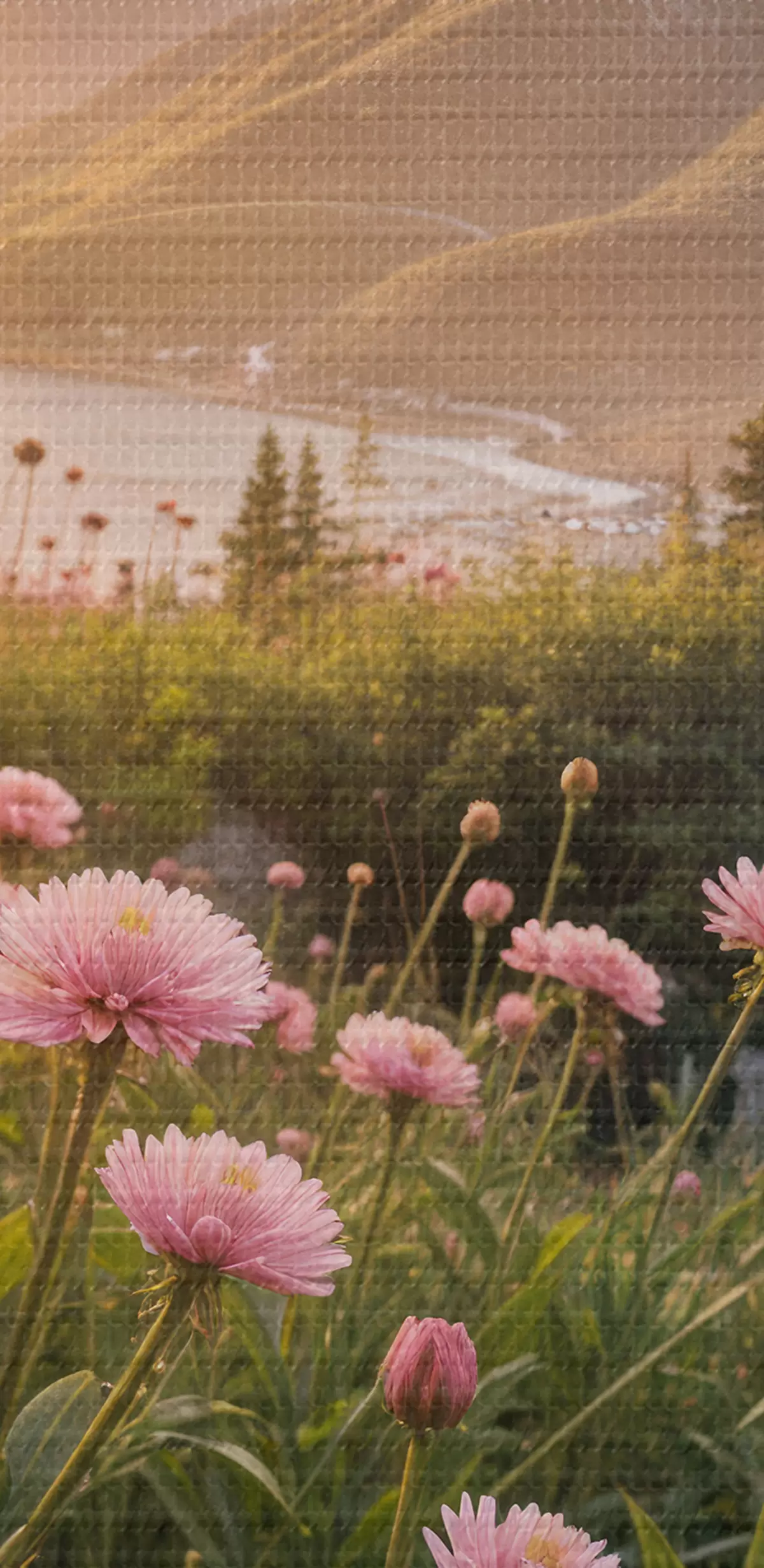 Obraz Pole růžových sedmikráskových květů v popředí s velkým pohořím v pozadí Č. s40154