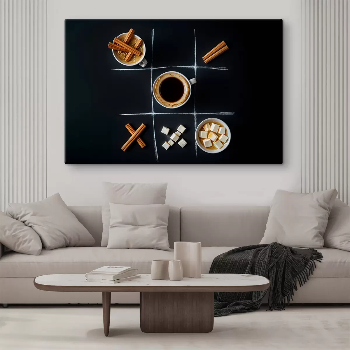 Obraz Šálek kávy se skořicovými tyčinkami, kostkami cukru a marshmallows uspořádanými do mřížky jako piškvorky Č. s40163