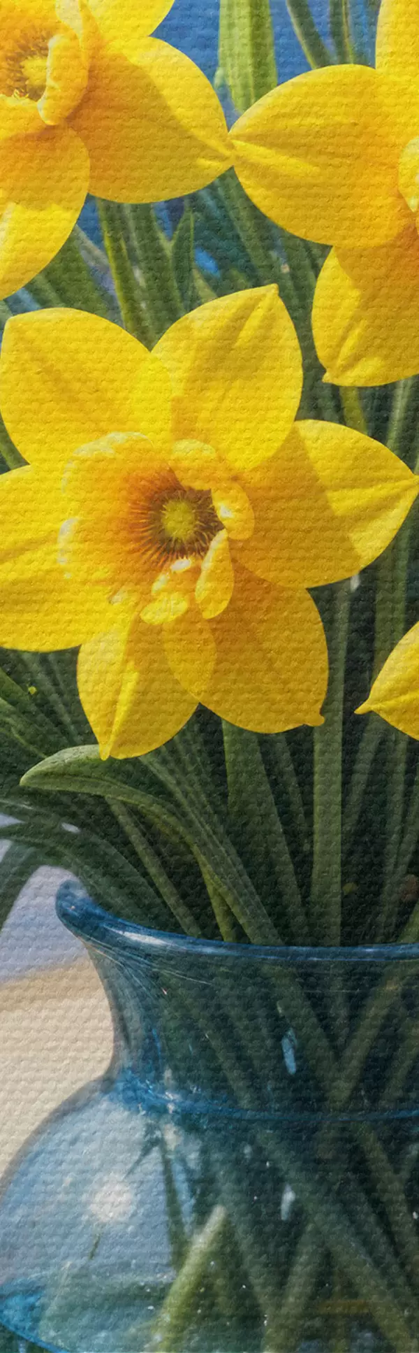Obraz Kytice žlutých narcisů a bílých sedmikrásek ve skleněné váze na parapetu s výhledem na pláž a oceán Č. s40171
