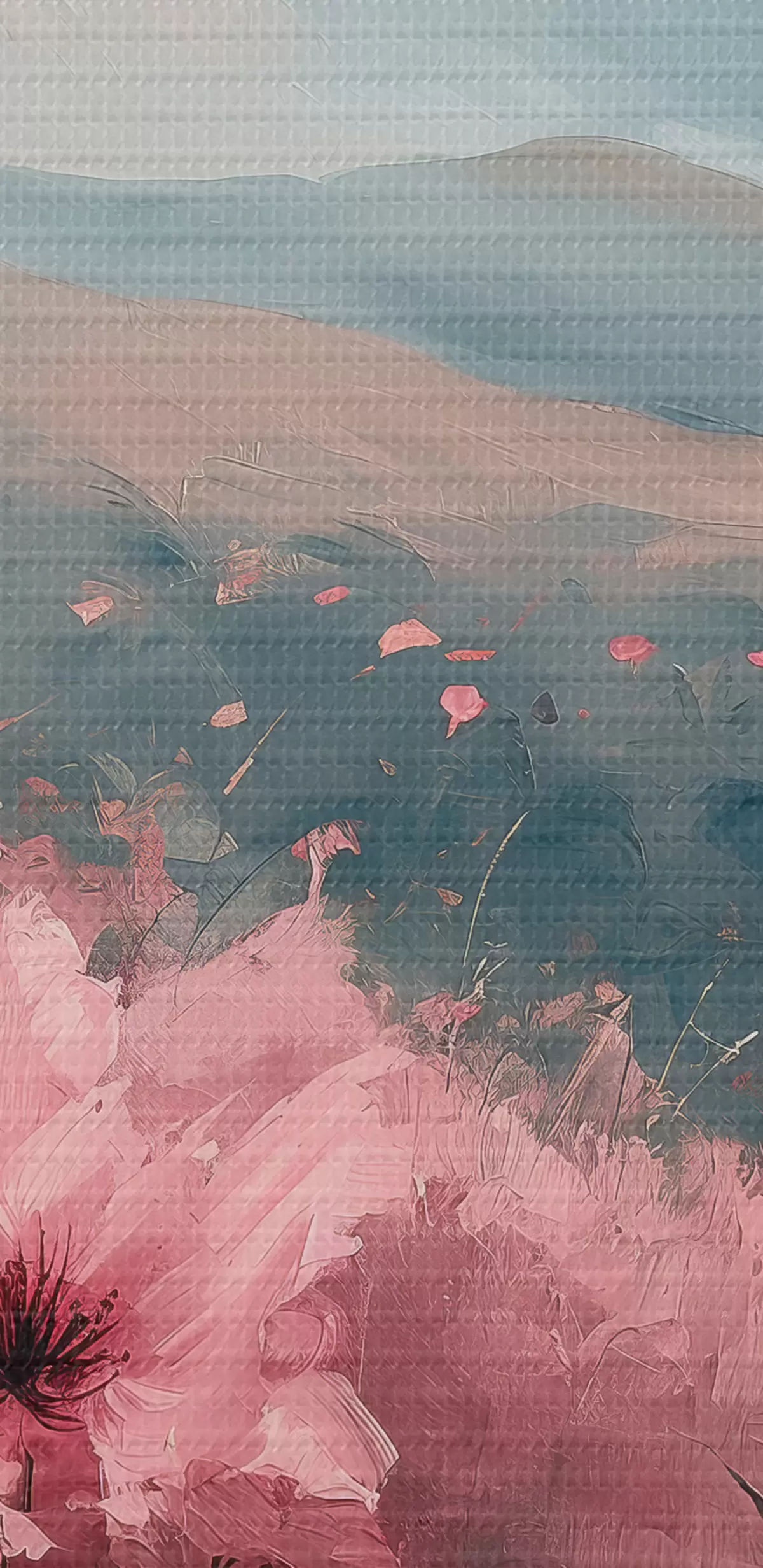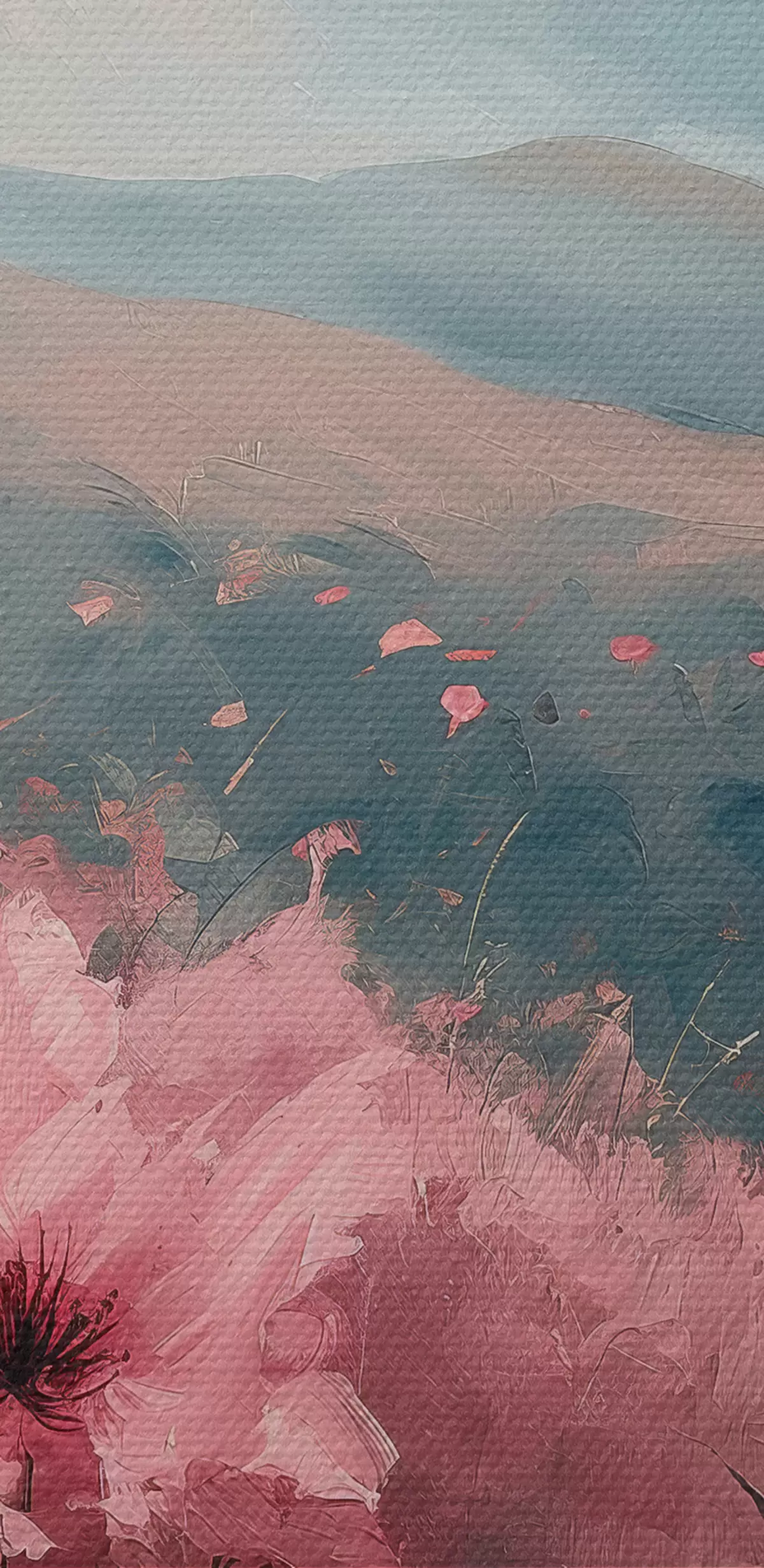 Obraz Růžové květy na louce, přírodní krajina, hory, olejomalba, živé tahy štětcem Č. s40233