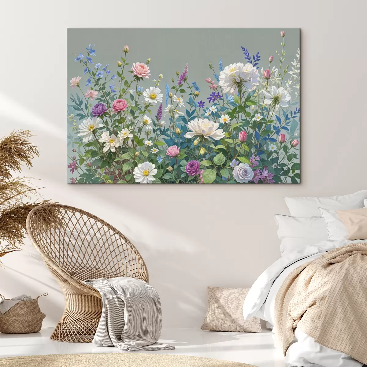 Obraz Svěží, pulzující zahrada plná různých barevných květin a kvetoucích rostlin na šedém pozadí Č. s40393