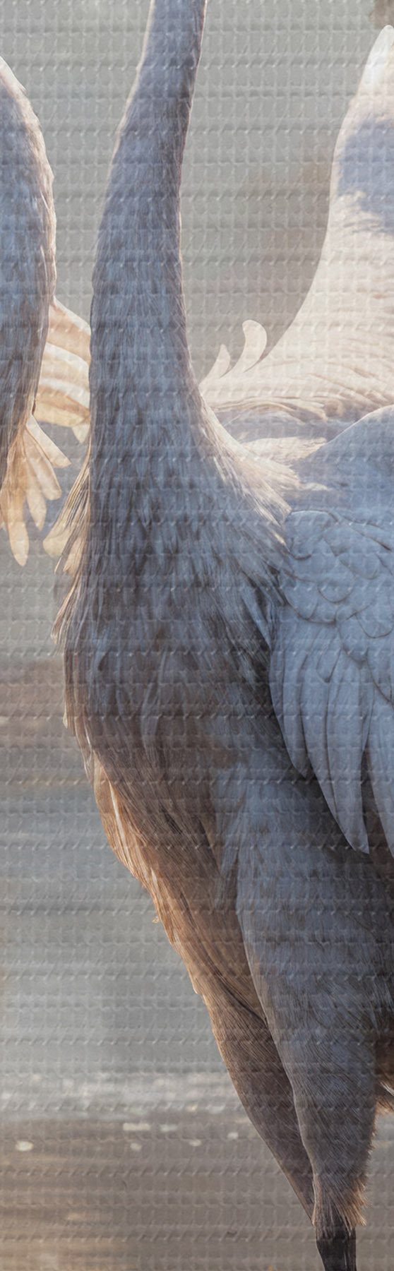 Obraz Dva velcí šedý jeřábi s dlouhými krky a křídly stojící v mlžném jezeře obklopeném stromy Č. s40404