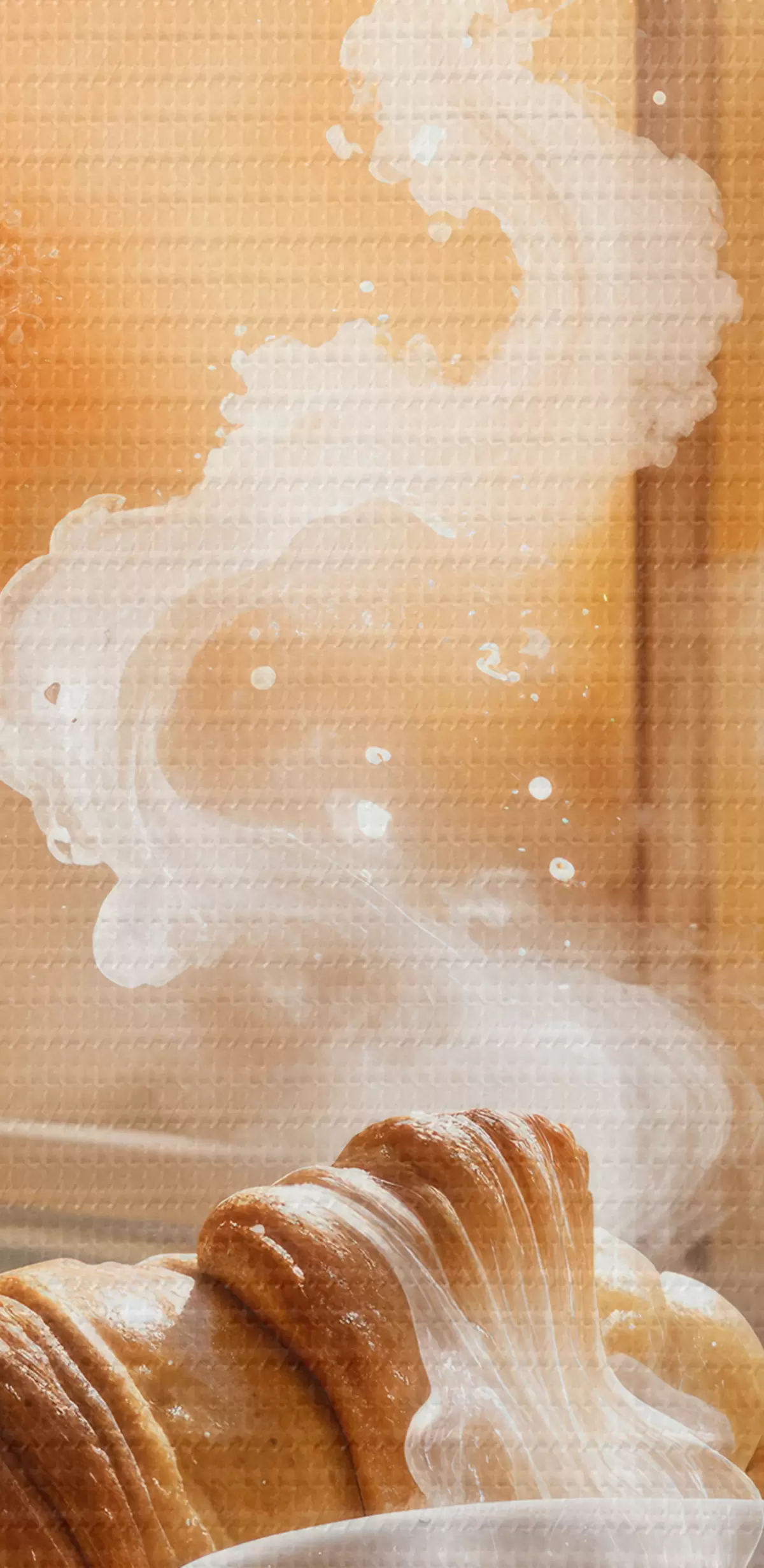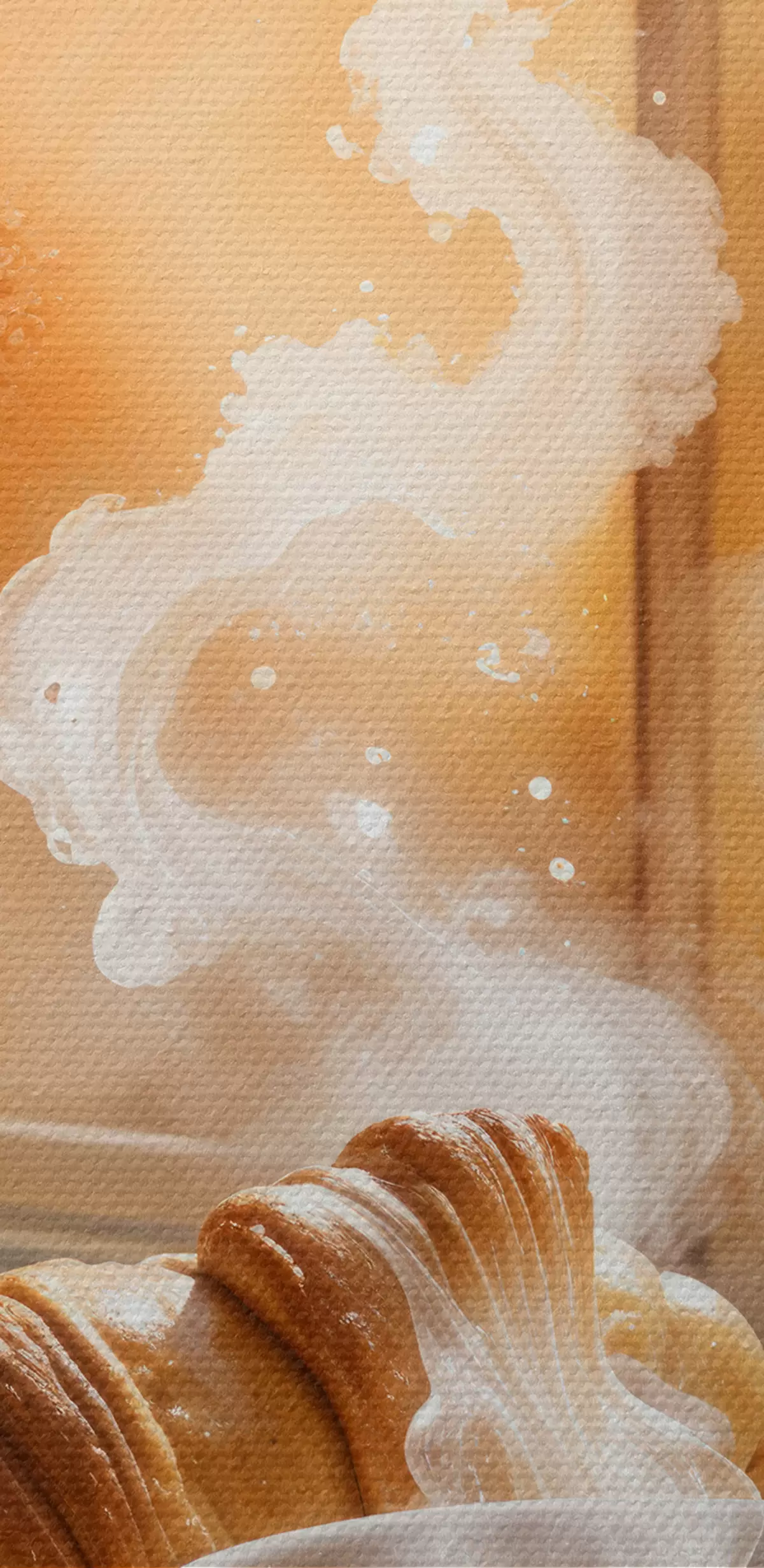 Obraz Teplý šálek kávy se stoupající párou, položený na stole vedle croissantu, s výhledem na historickou budovu Č. s40405