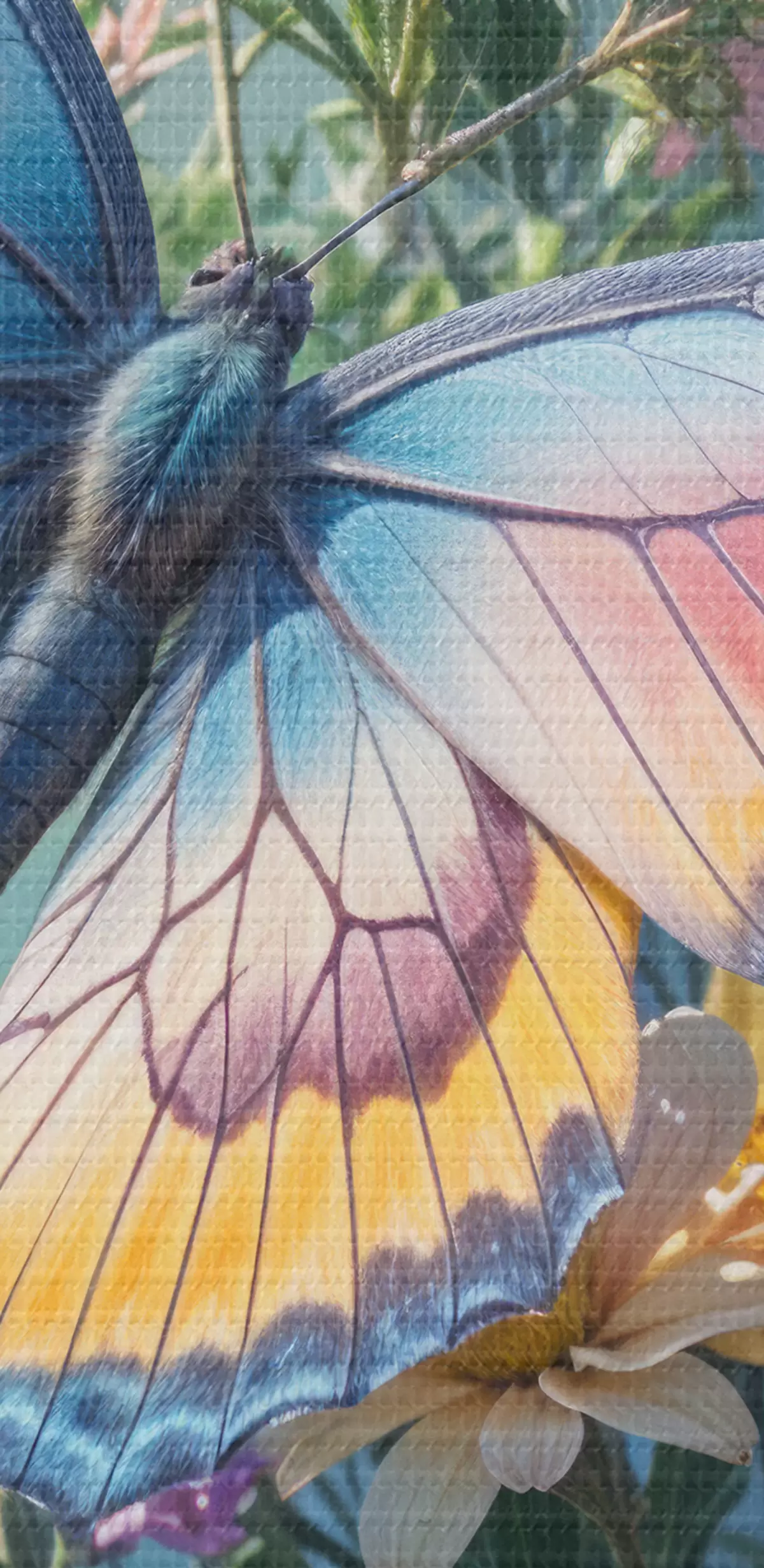 Obraz Velký, barevný motýl posazený na kytici růžových a žlutých květů na tmavě zeleném pozadí Č. s40411
