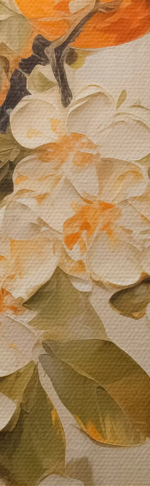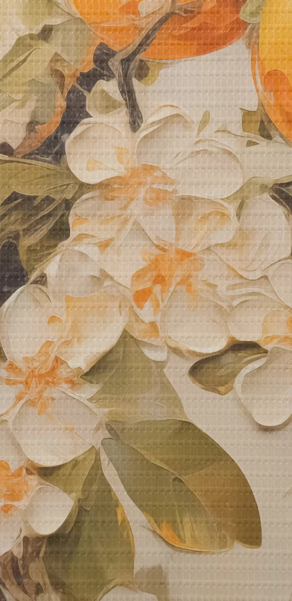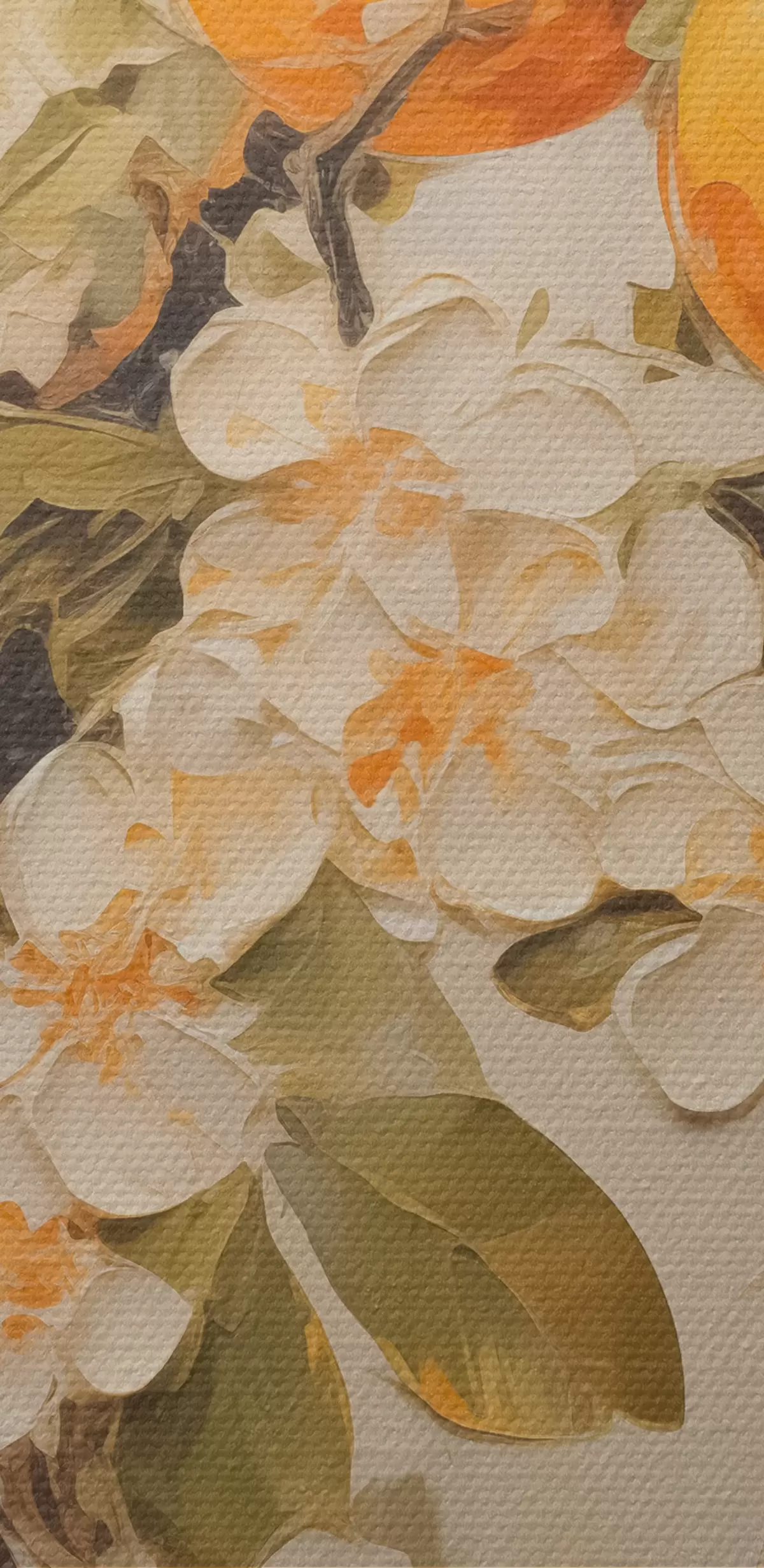 Obraz Větev s bílými květy a pomeranči na šedo-béžovém pozadí Č. s40486