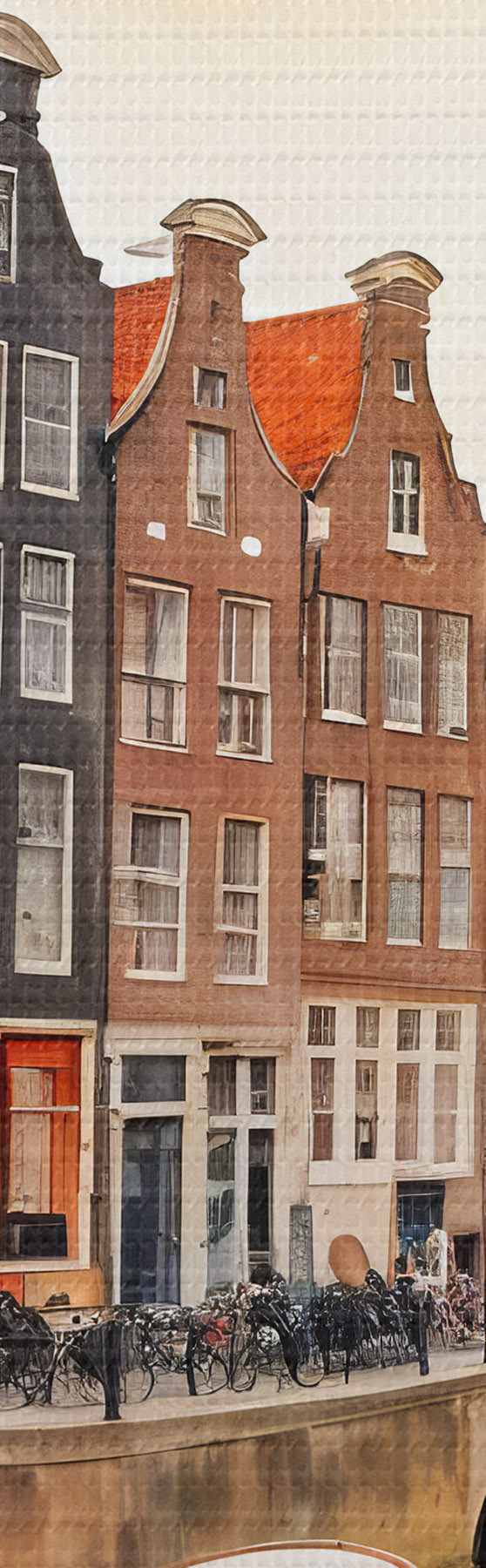 Obraz Barevné akvarelové panoráma Amsterdamu s tradičními holandskými domy u kanálu a čluny na vodě Č. s40561