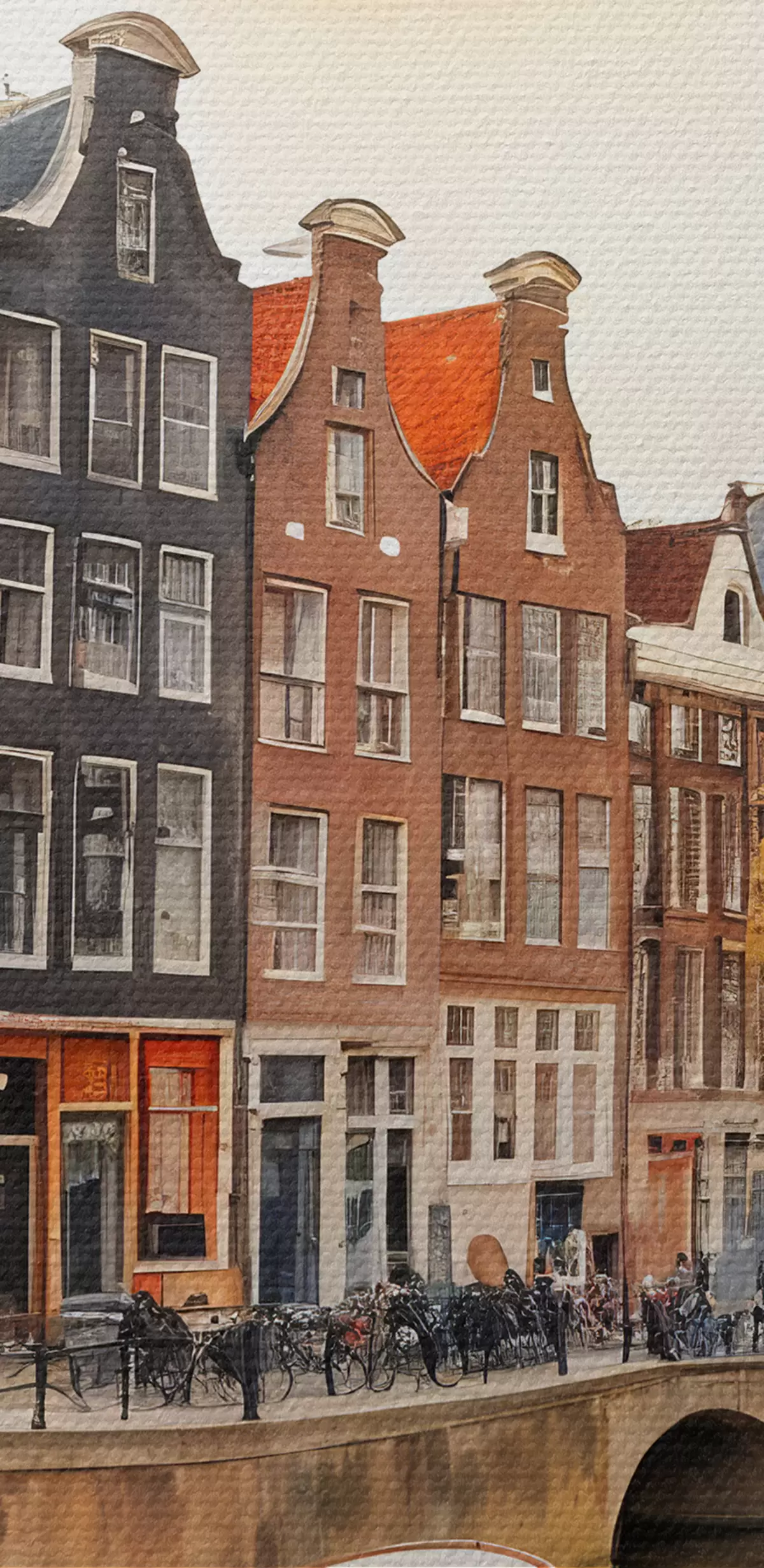 Obraz Barevné akvarelové panoráma Amsterdamu s tradičními holandskými domy u kanálu a čluny na vodě Č. s40561