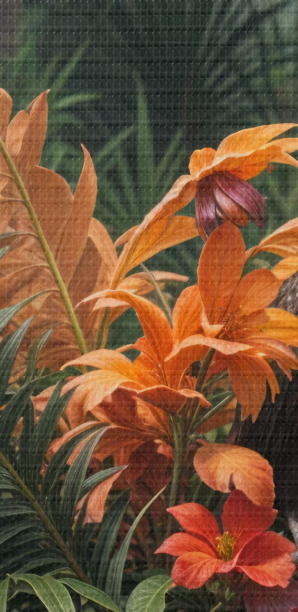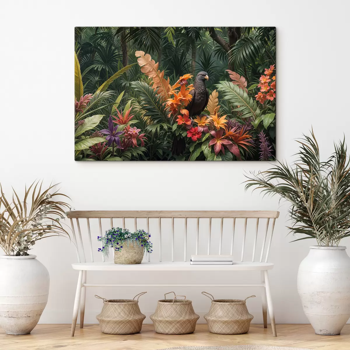Obraz Tropický pták posazený na větvi obklopený živými listy, palmovými listy, květinami a exotickými rostlinami Č. s40578