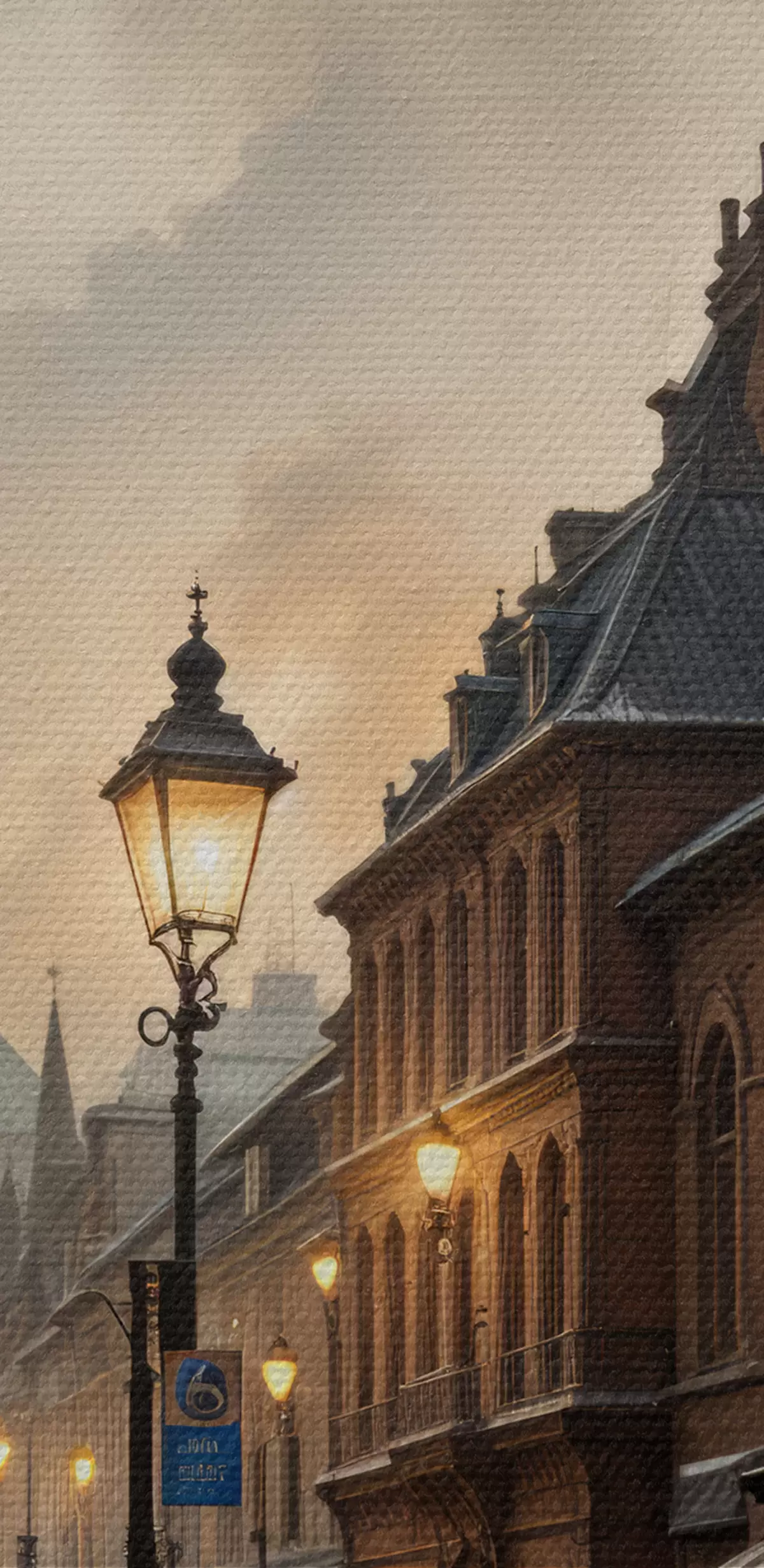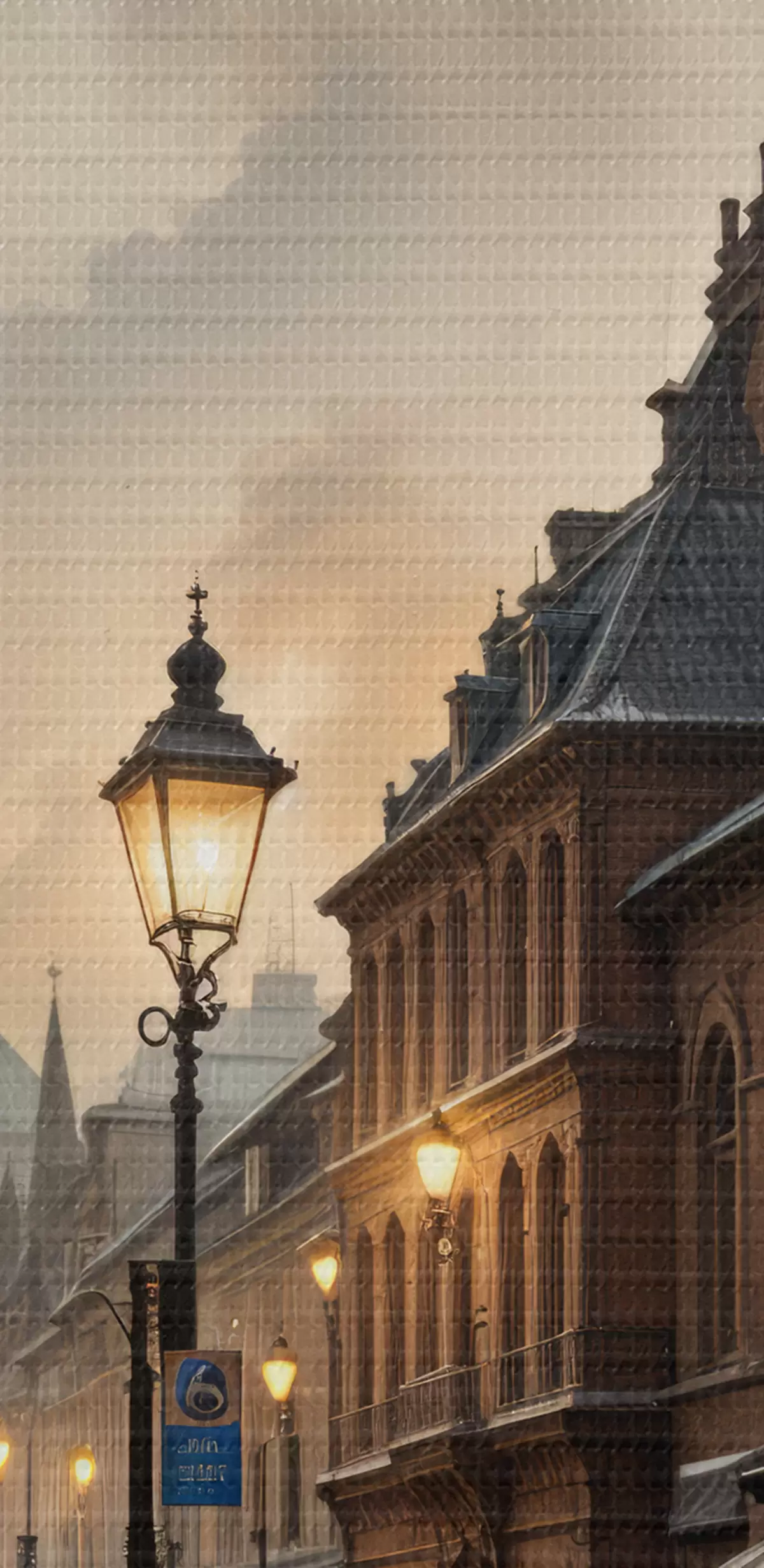 Obraz Deštivý večer ve starém evropském městě s dlážděnými ulicemi, historickými budovami a projíždějící tramvají Č. s40604
