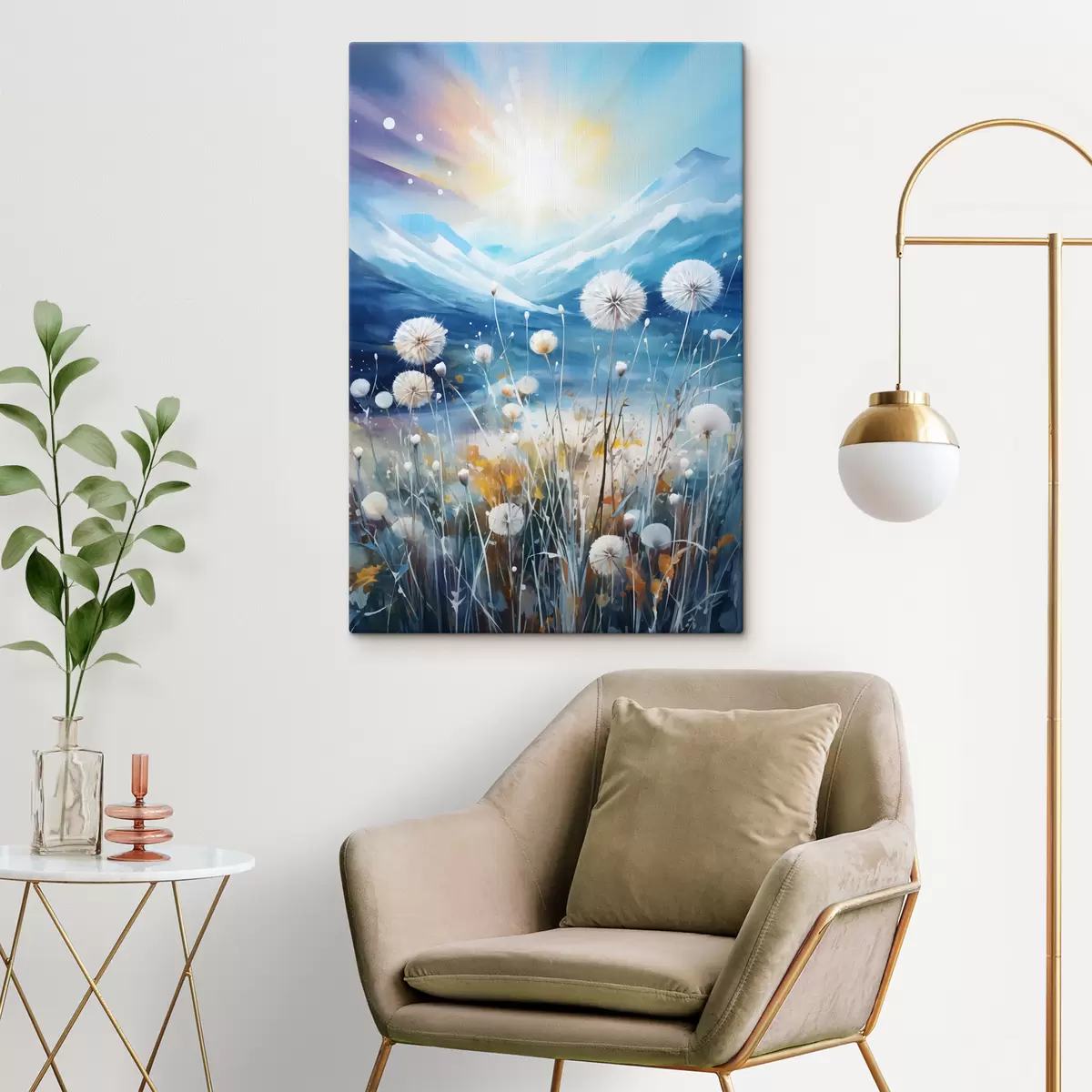 Obraz Sluncem ozářené hory a květy pampelišek Č. s40720