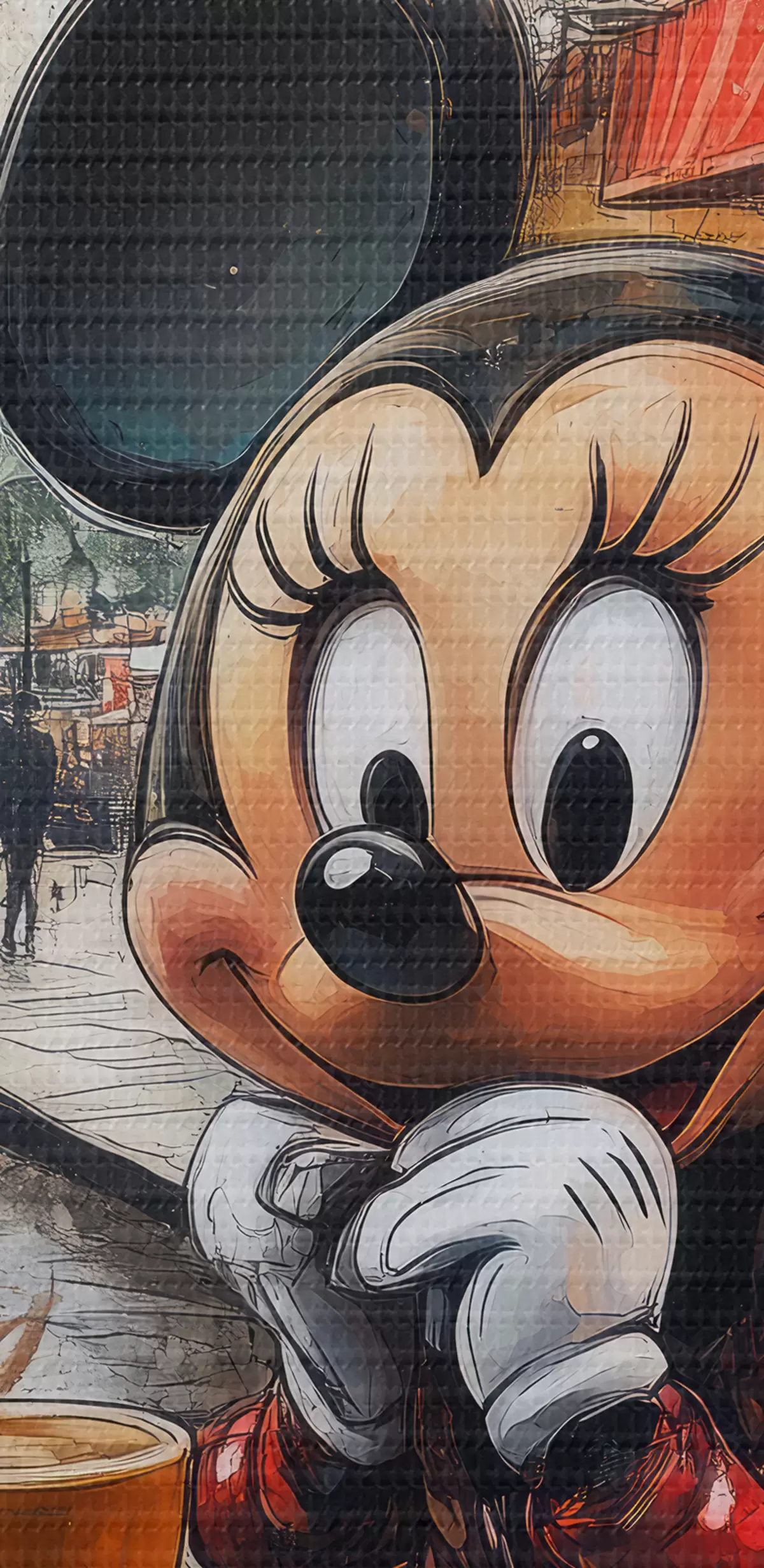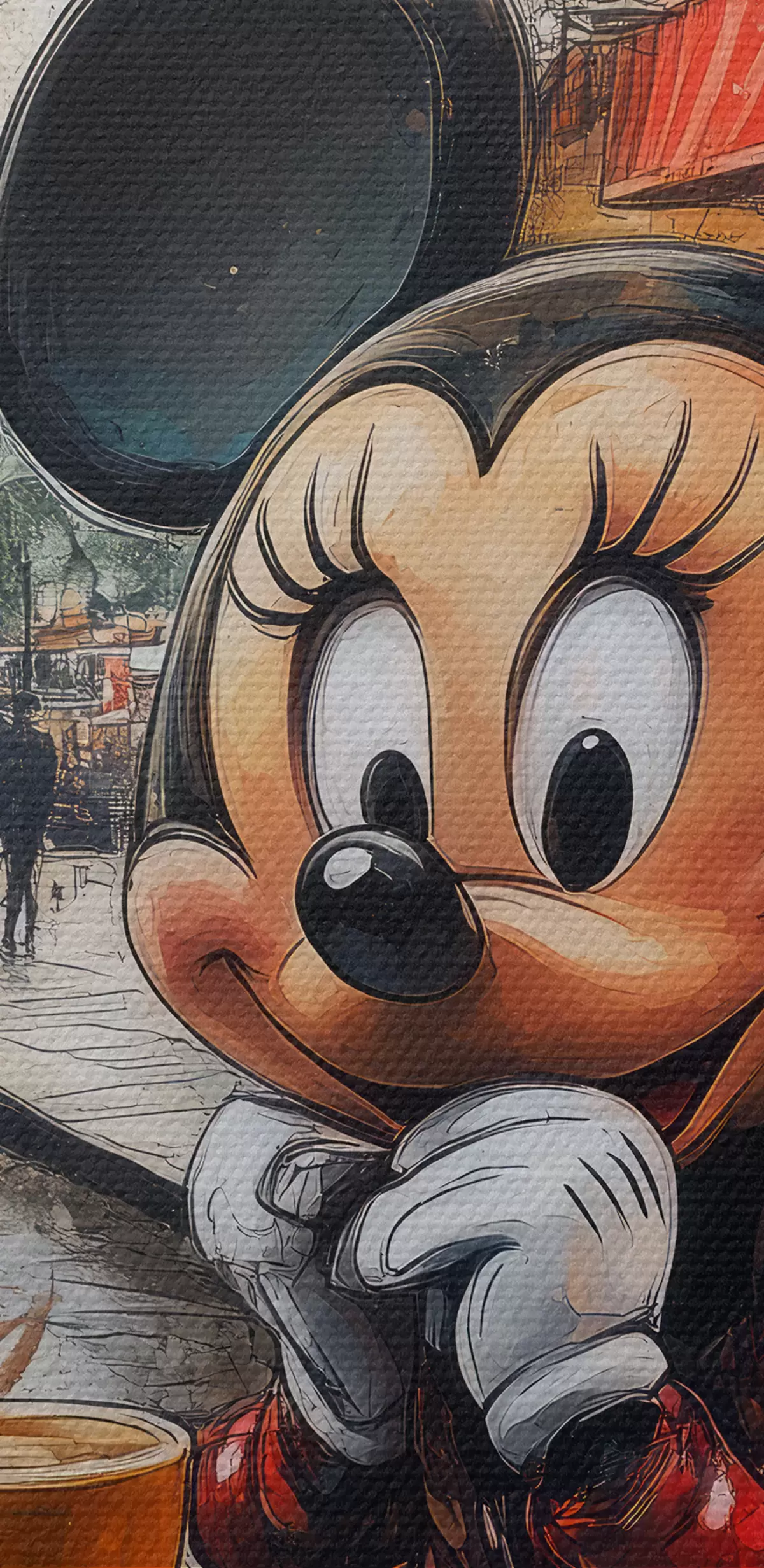 Obraz Mickey Mouse dívka pije kávu na pozadí Eiffelovy věže v Paříži Č. s40972
