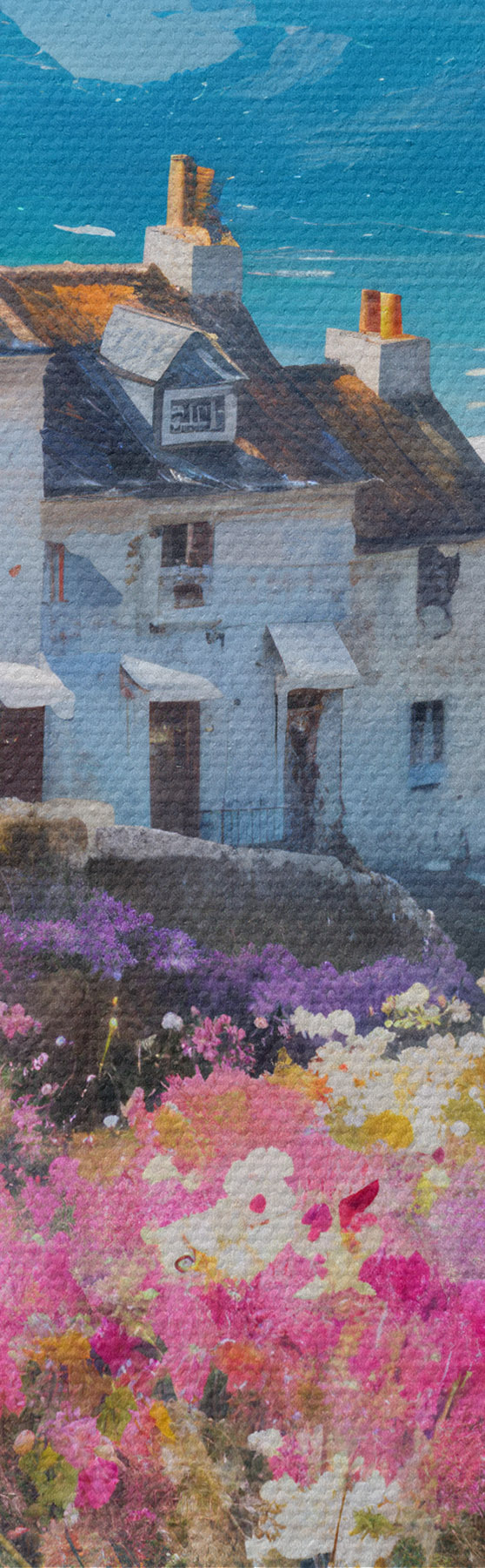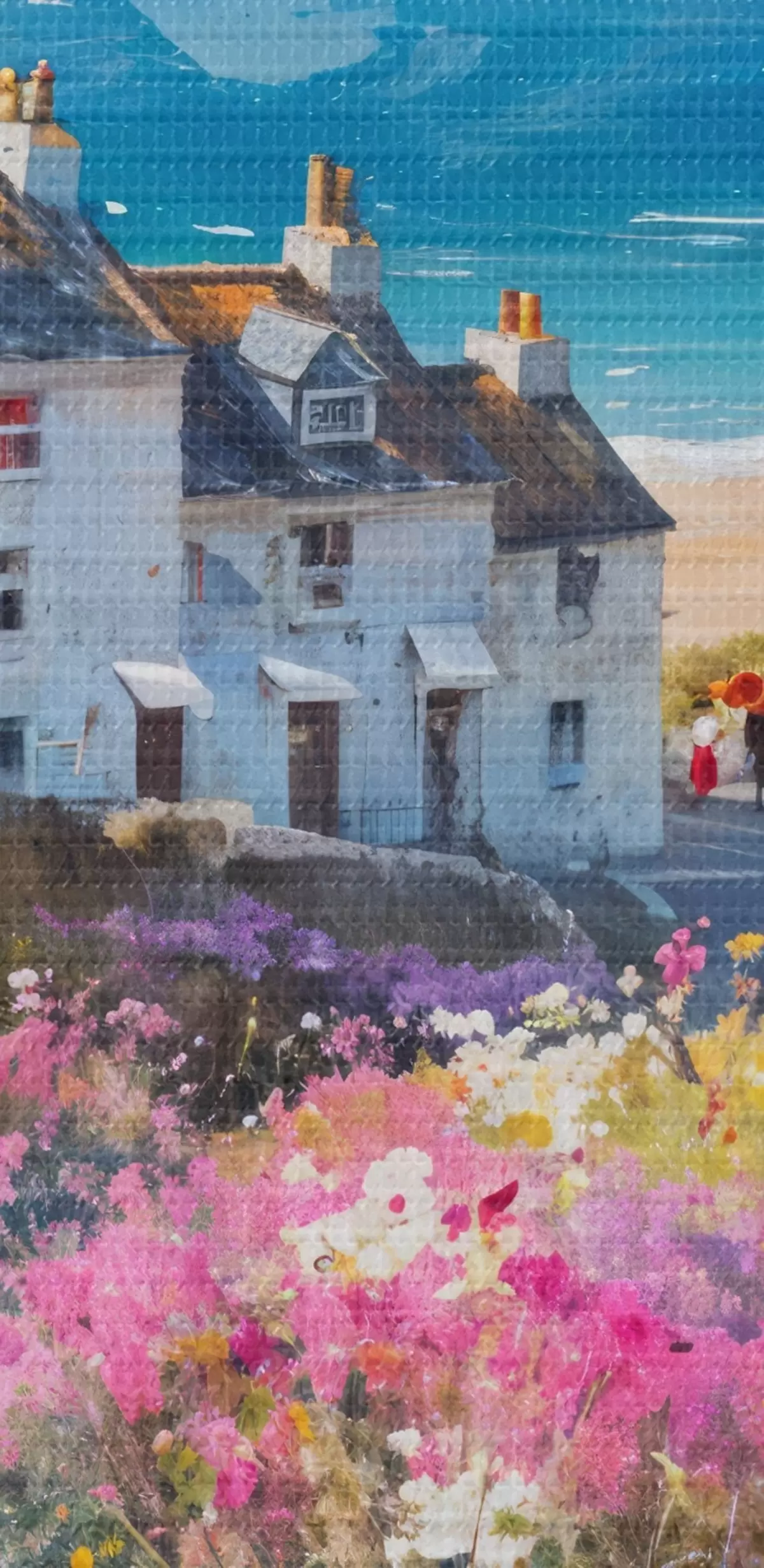 Obraz Barevná olejomalba pobřežního městečka s bílými domy a živou květinovou zahradou v popředí Č. s41090