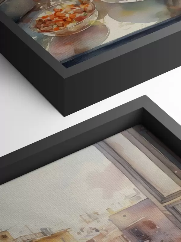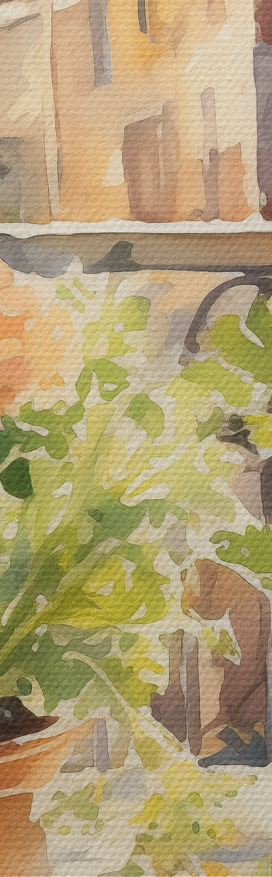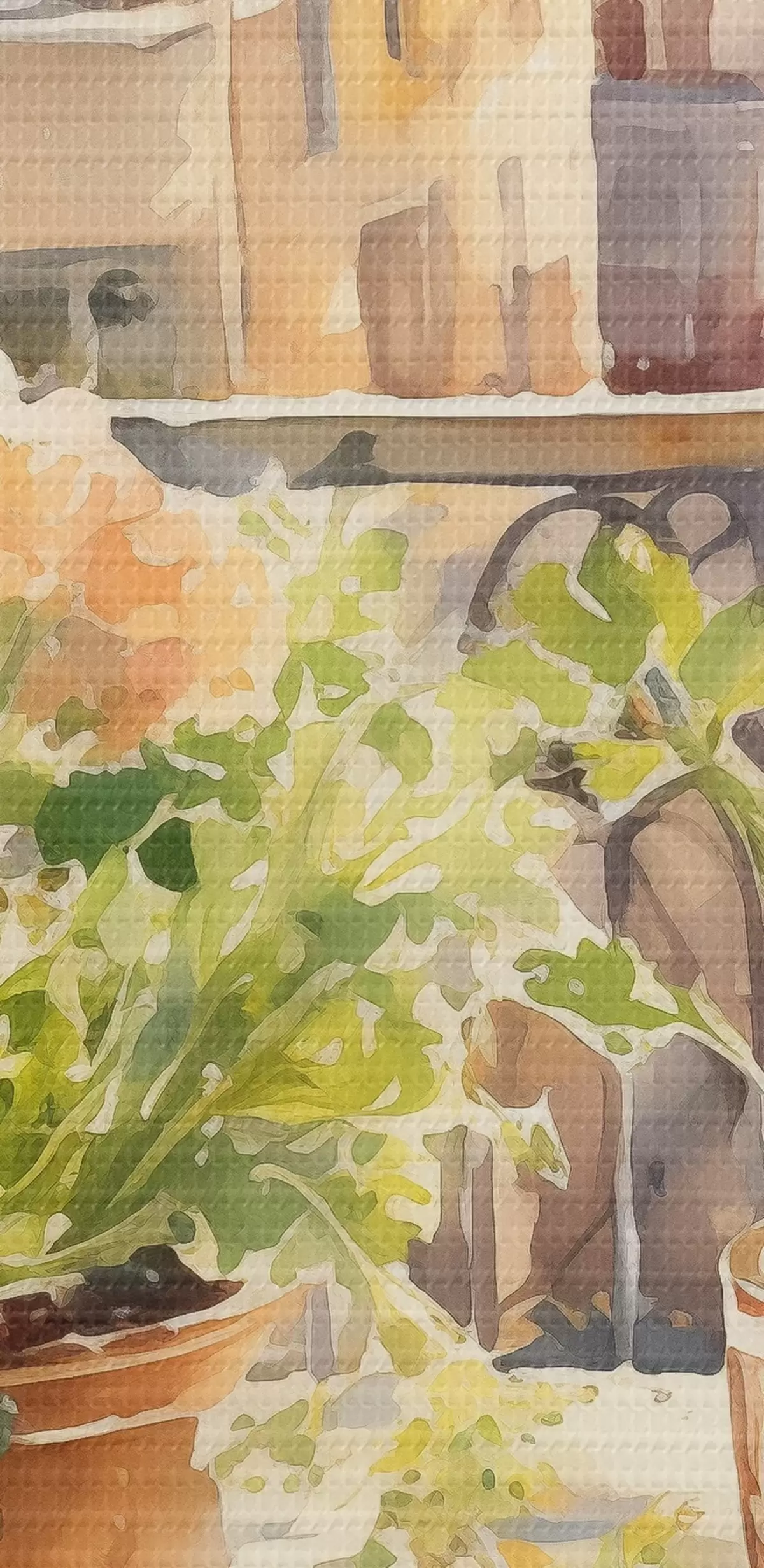 Obraz Akvarelová večeře, pohled na město, květiny, příroda, zelený salát Č. s41166