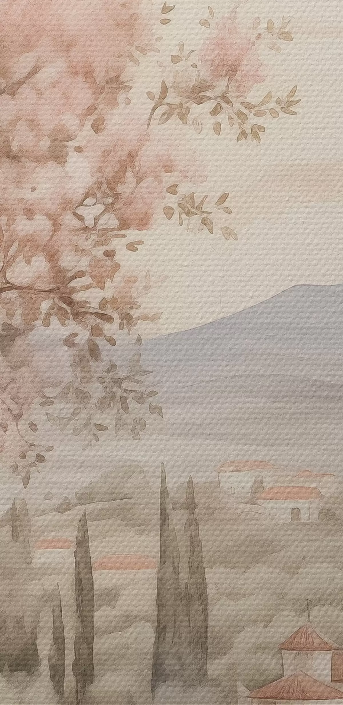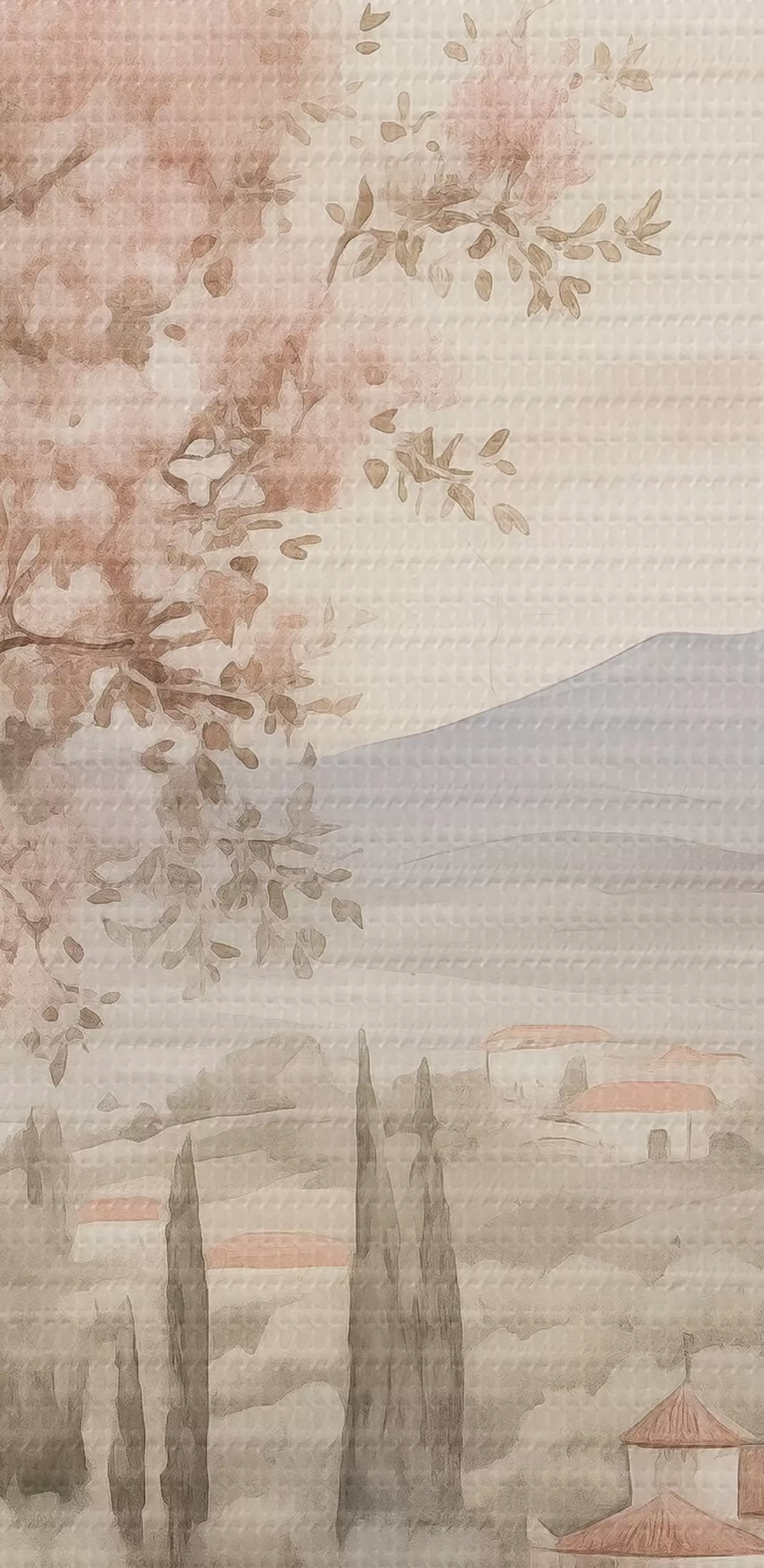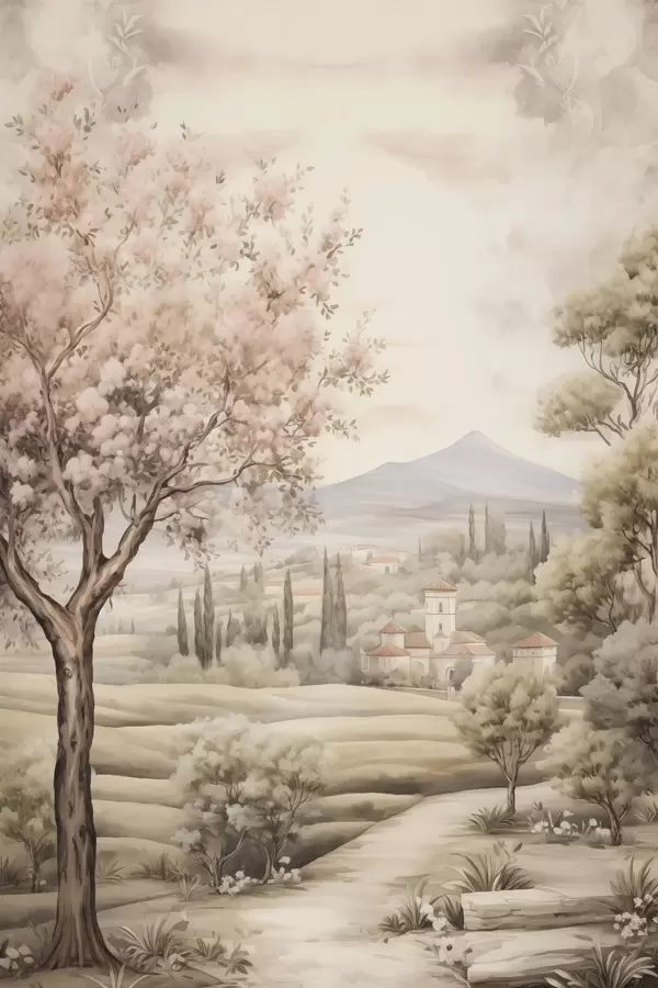 Obraz Akvarel kopce, kvetoucí třešeň, hrad, rustikální styl Č. s41225