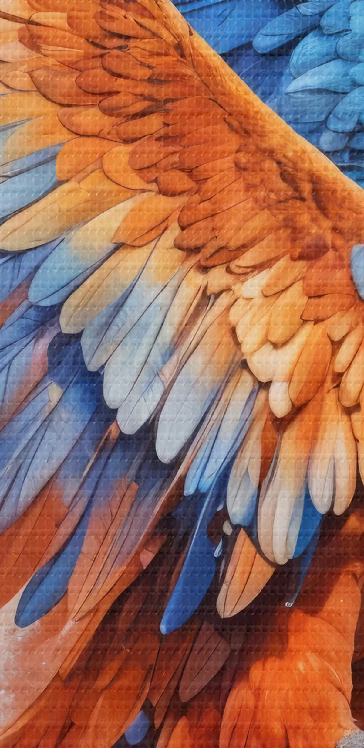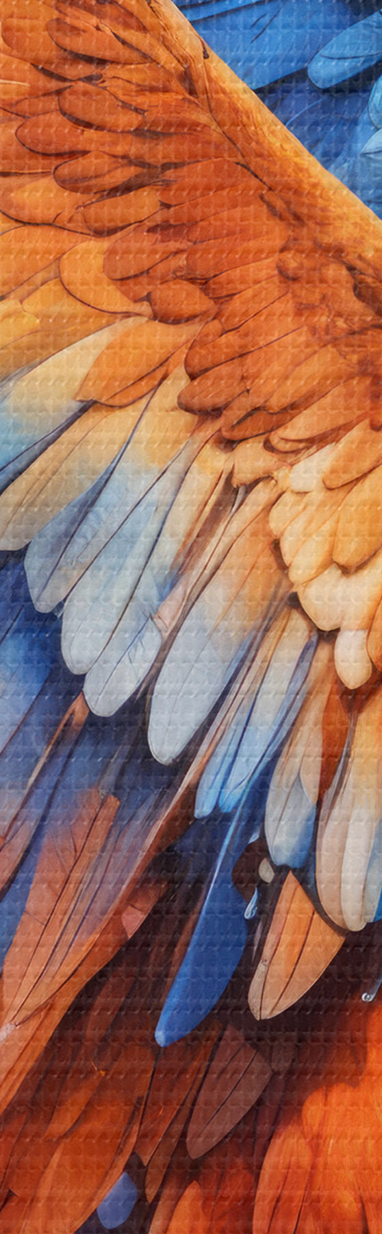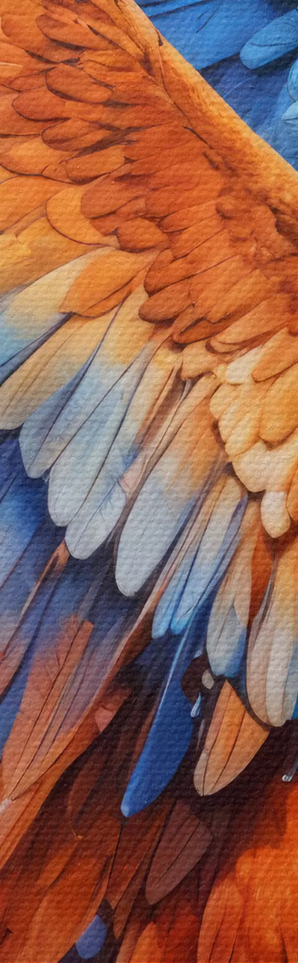 Obraz Barevný papoušek se zářivě modrým, oranžovým a žlutým peřím v letu na potřísněném pozadí Č. s41250