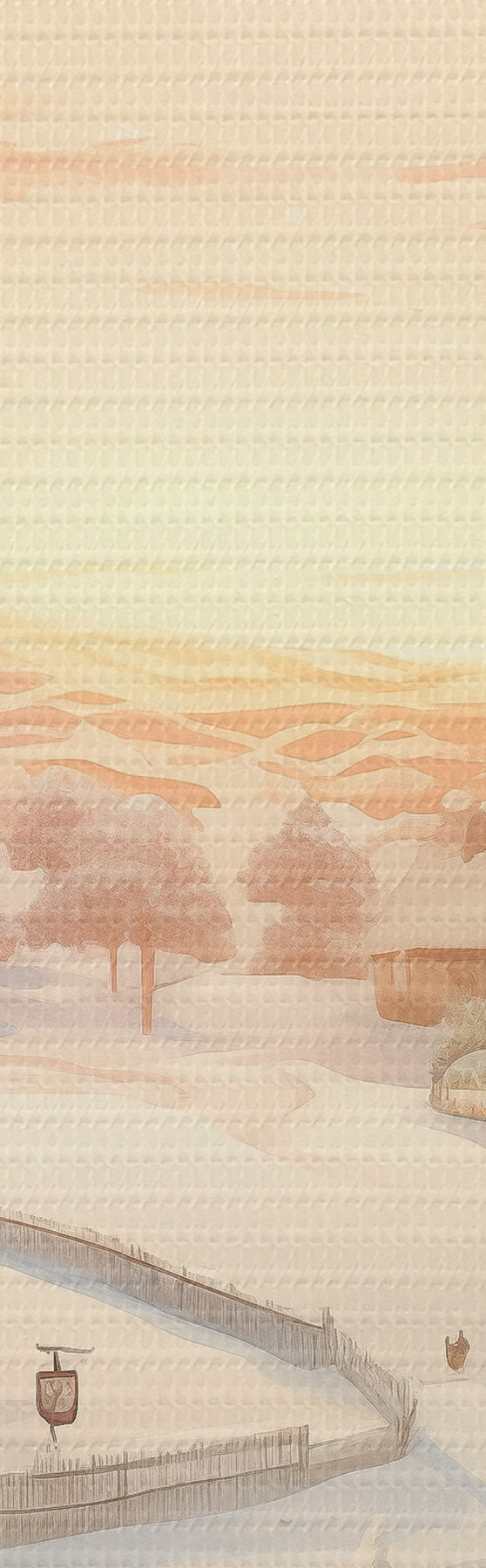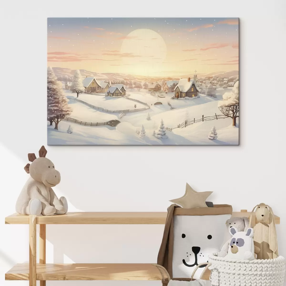 Obraz Zimní vesnice při západu slunce, domy pokryté sněhem, borovice Č. s41380
