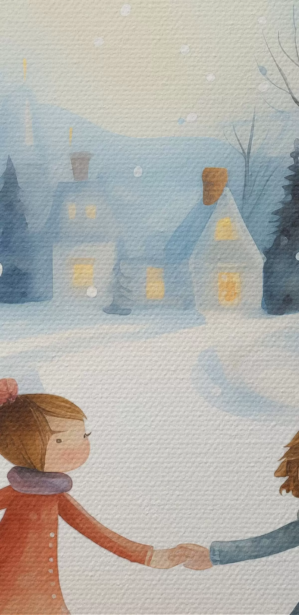 Obraz Dívky v zimní vesnici, sněhové vločky, akvarel, domy, les Č. s41385