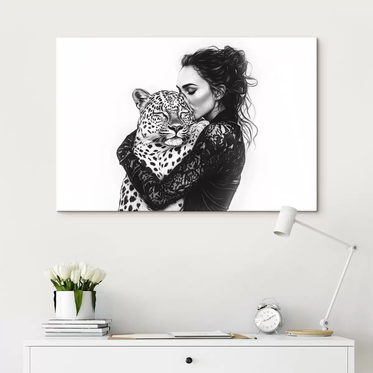 Obraz Žena líbající leoparda, kresba tužkou, divoká zvířata, černobíle Č. s41457