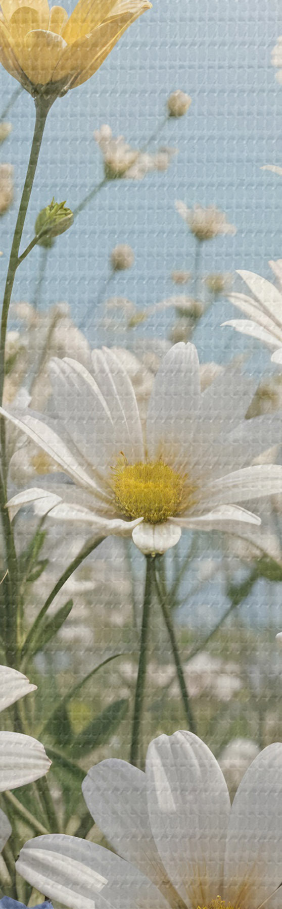 Obraz Pole bílých a žlutých sedmikrásek na modré obloze s nadýchanými bílými mraky a motýly letícími nad nimi Č. s41726