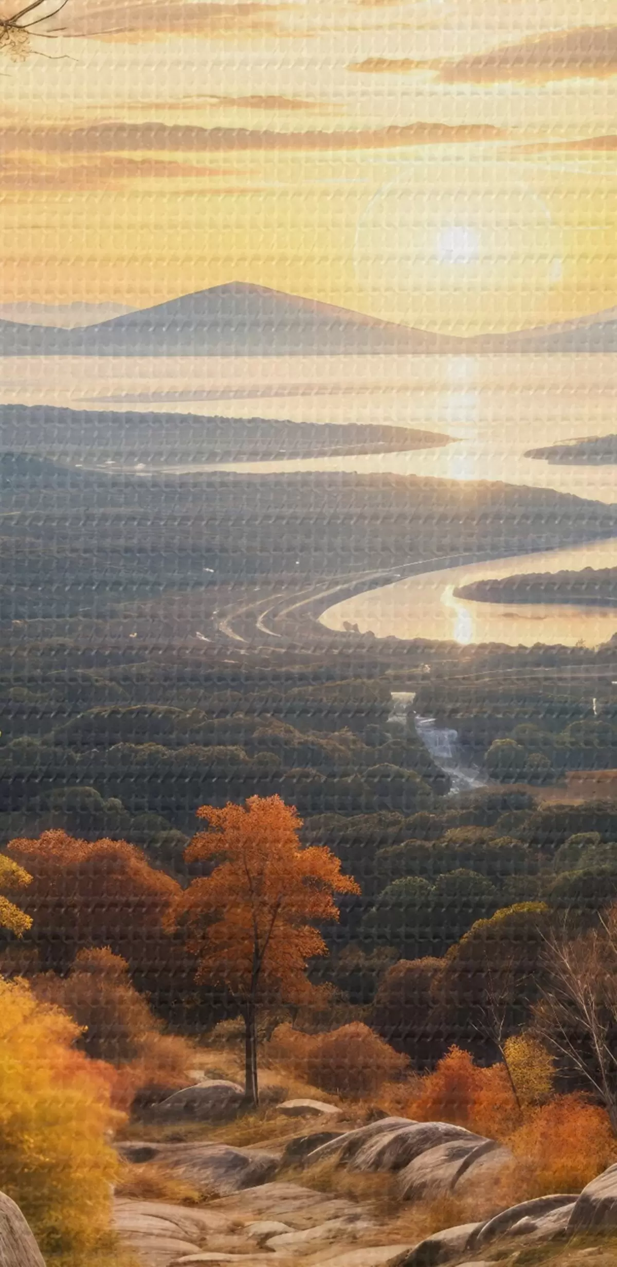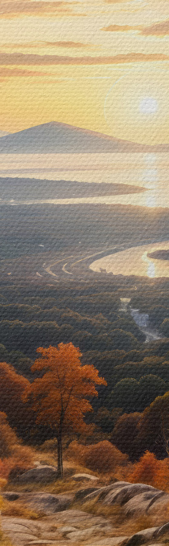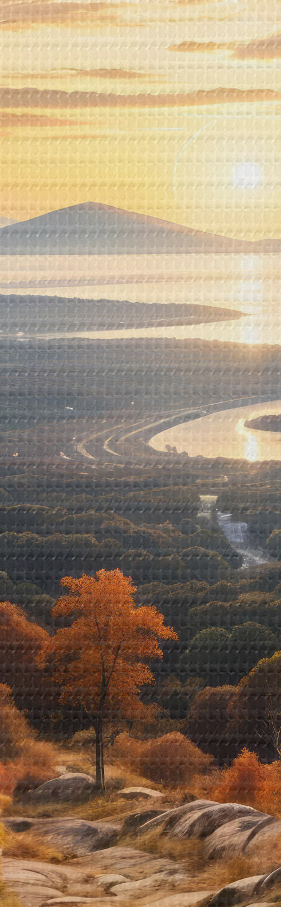 Obraz Krajina s klikatou polní cestou vedoucí lesem podzimně zbarvených stromů a oblohou při západu slunce Č. s41732