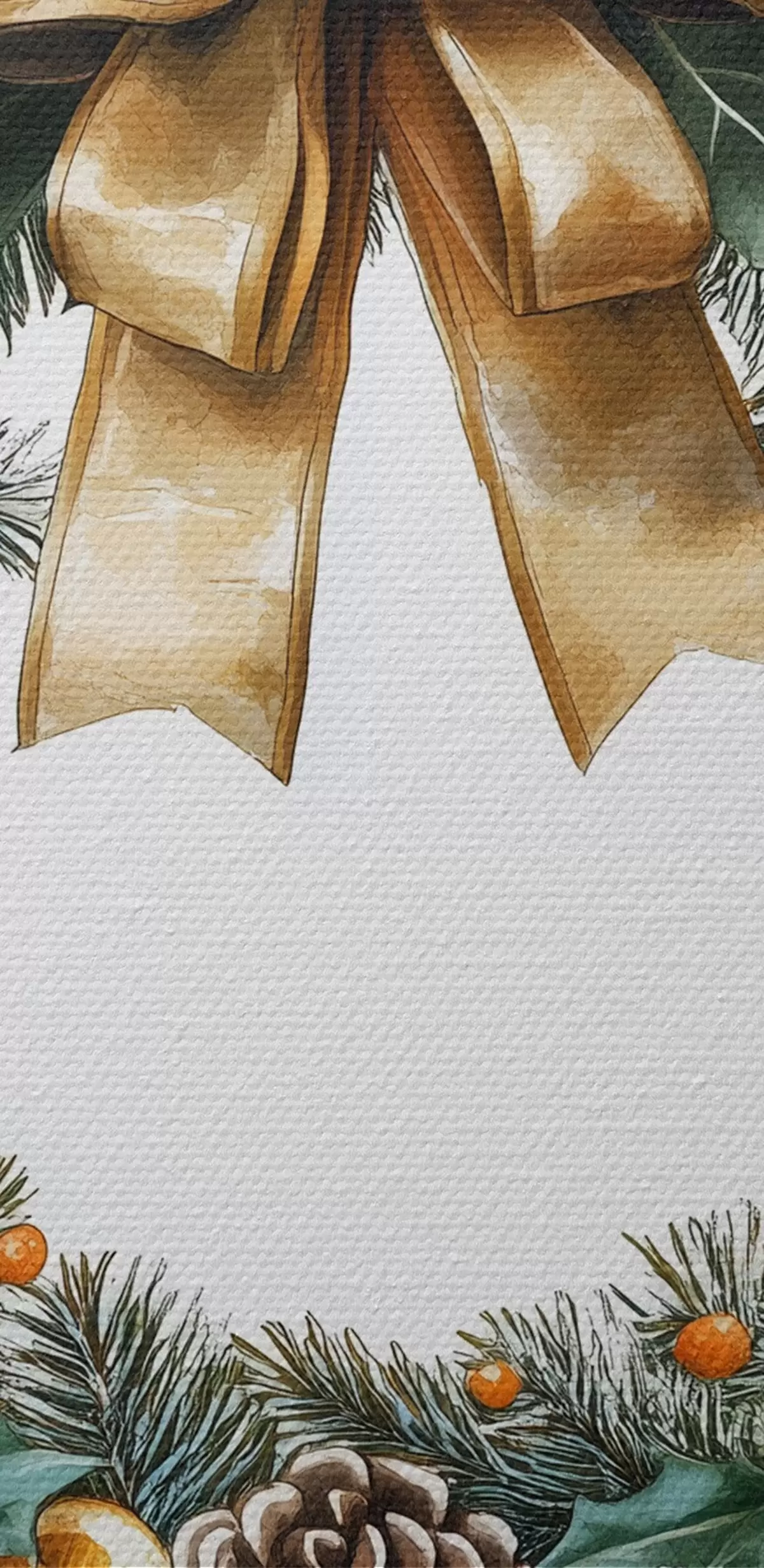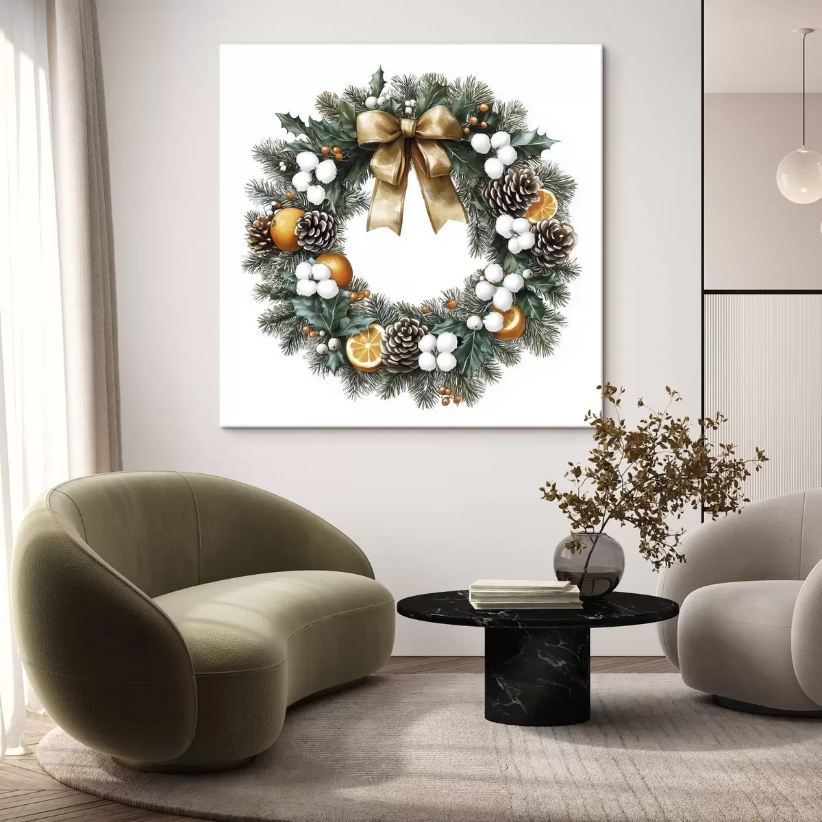 Obraz Vánoční borovicový věnec s mašlí, bavlnou, pomeranči, bobulemi a šiškami Č. s41962