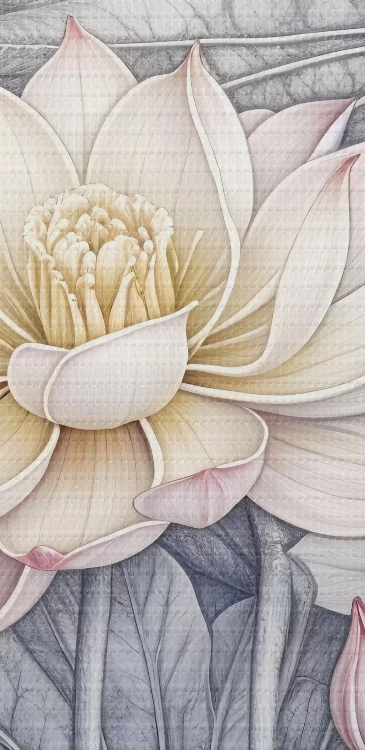 Obraz Velké růžové a bílé květy lotosu se zelenými listy a stonky na světlém pozadí s detailně propracovanými okvětními lístky a středy Č. s42221
