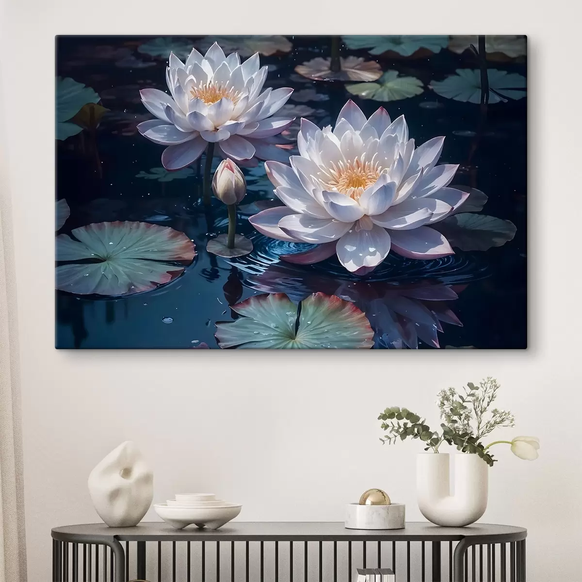 Obraz Bílé květy lotosu plovoucí na klidném rybníku s lekníny Č. s42225