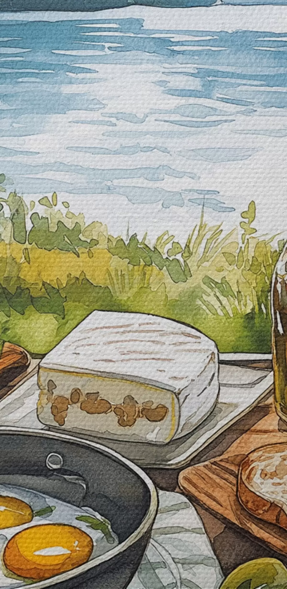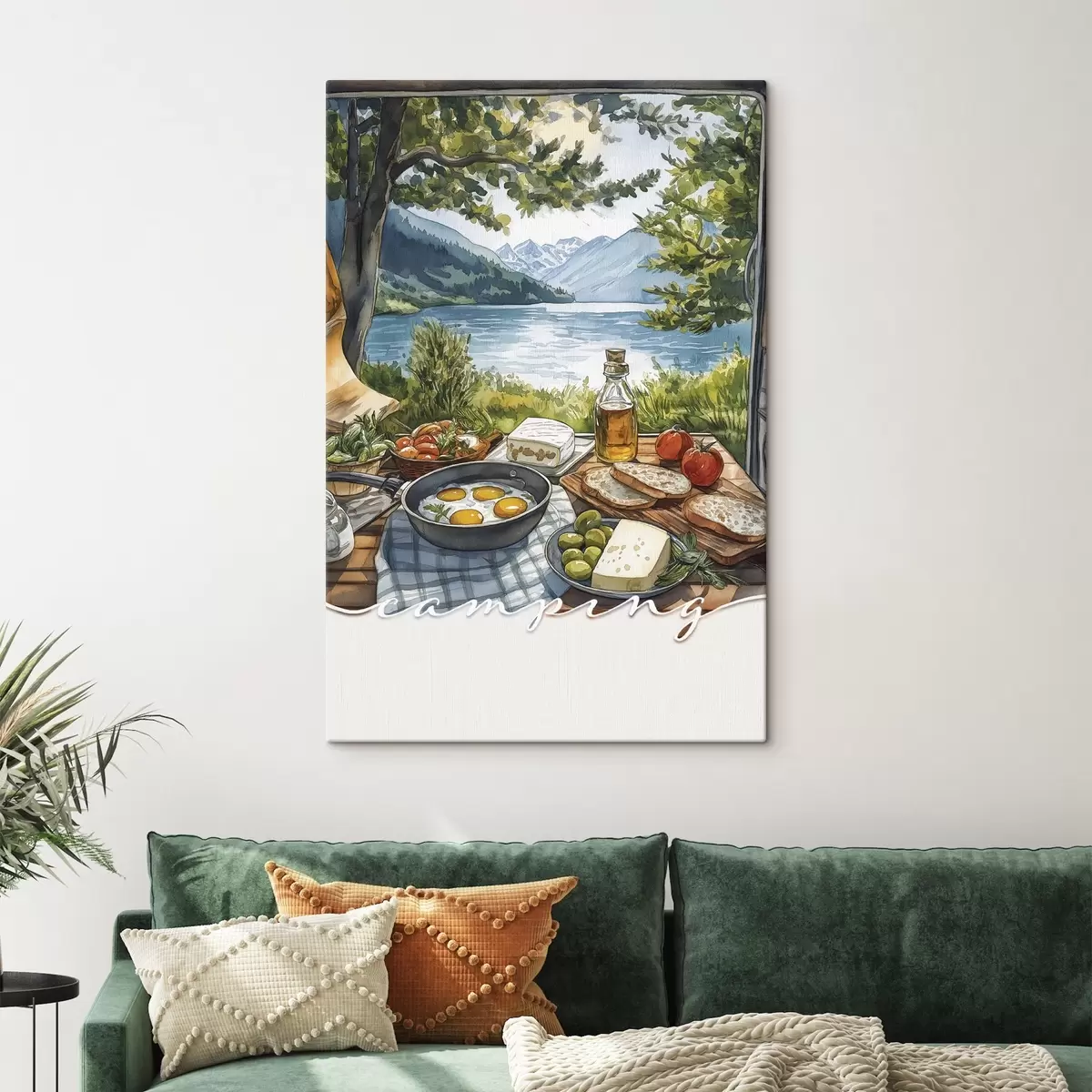Obraz Estetika kempování, akvarel, letní jezero, příroda, jídlo Č. s42428