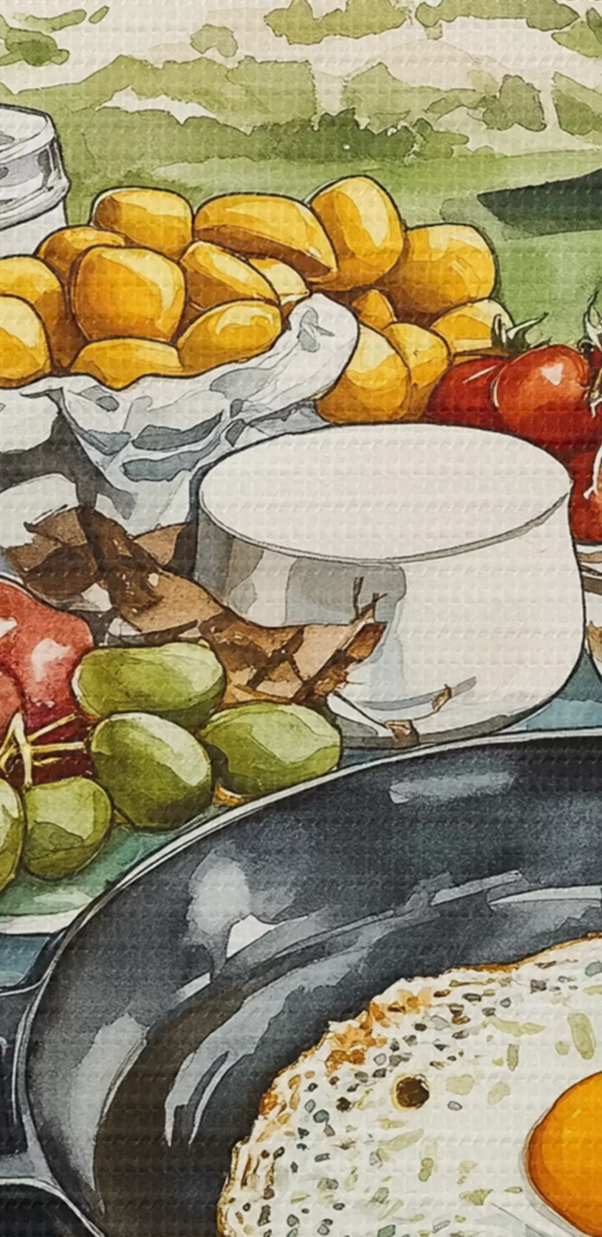 Obraz Krásná snídaně ve stylu akvarelu, život v dodávce, kempování, hory Č. s42429