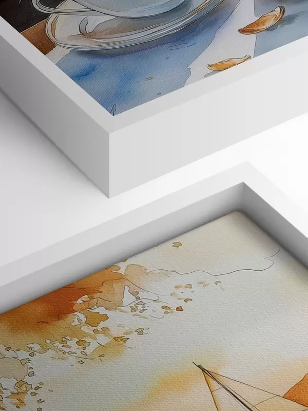 Obraz Západ slunce na jezeře, plachetnice, šálky kávy, akvarelový styl Č. s42442