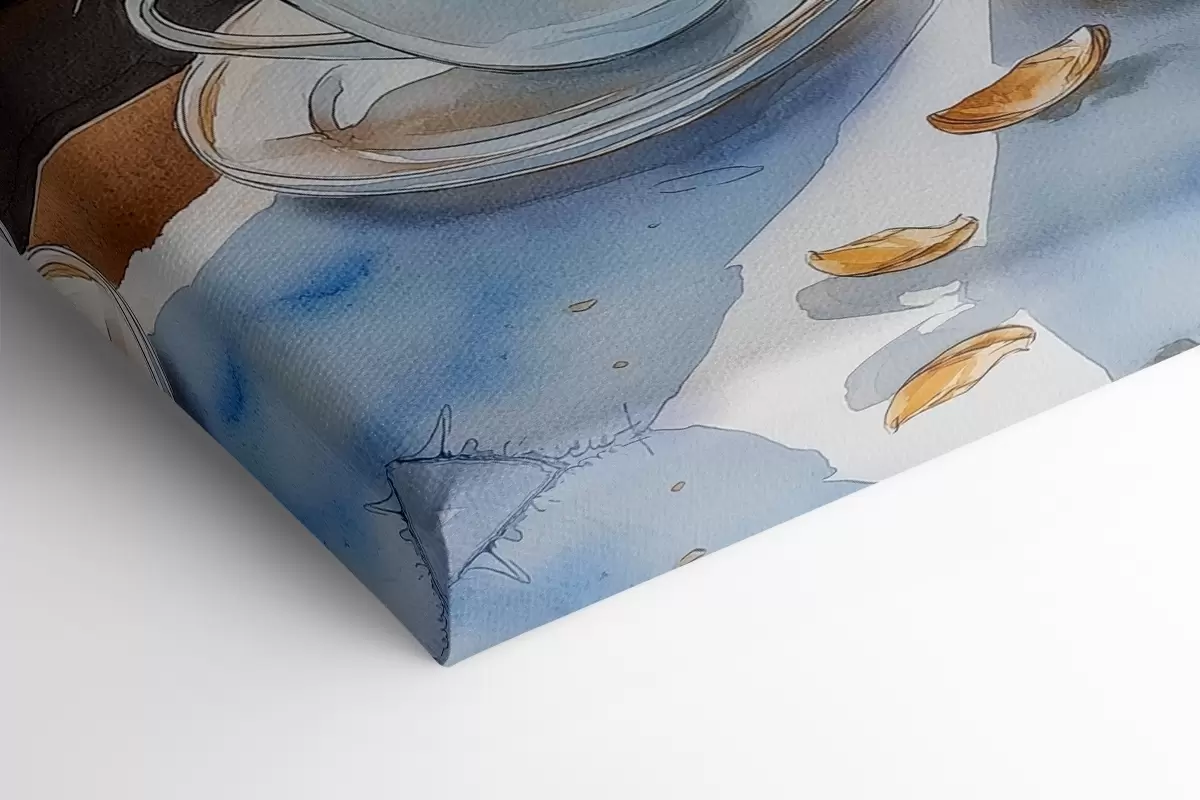 Obraz Západ slunce na jezeře, plachetnice, šálky kávy, akvarelový styl Č. s42442