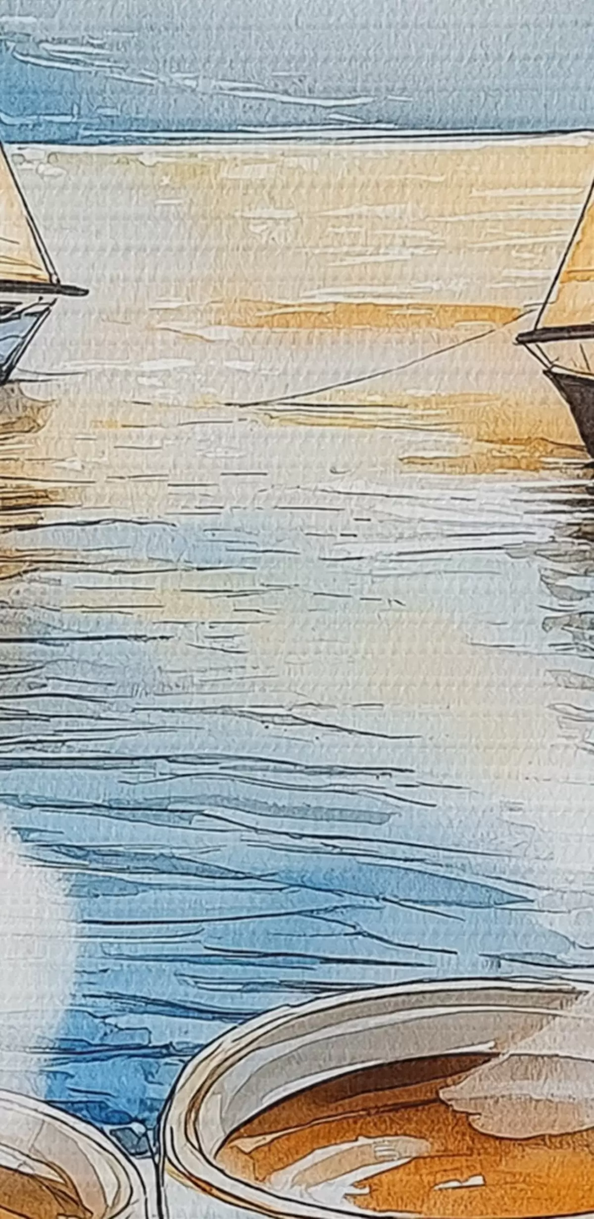 Obraz Západ slunce na jezeře, plachetnice, šálky kávy, akvarelový styl Č. s42442