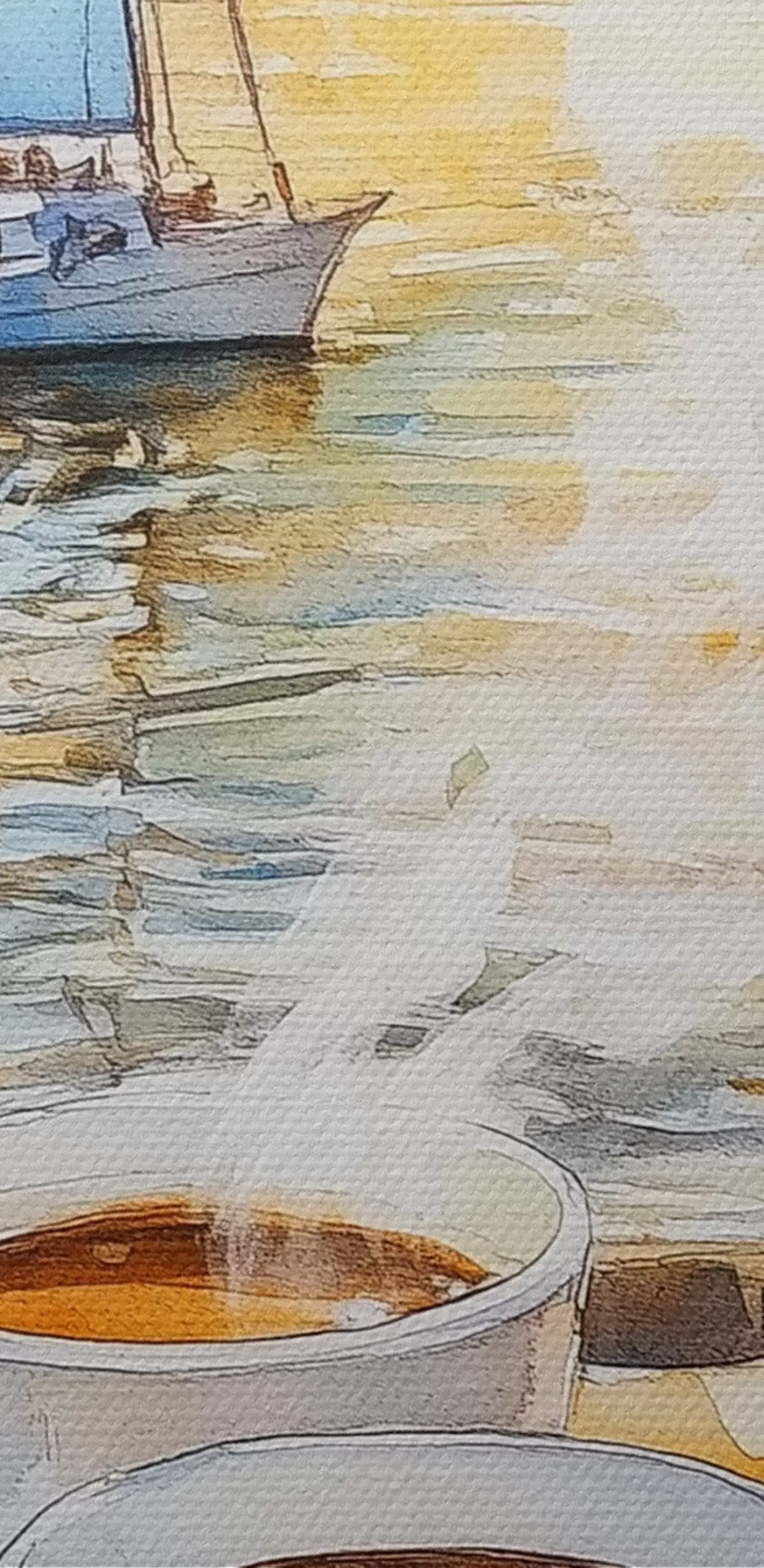 Obraz Šálky kávy, barvy západu slunce, jezero, plachetnice, příroda, cestování Č. s42443