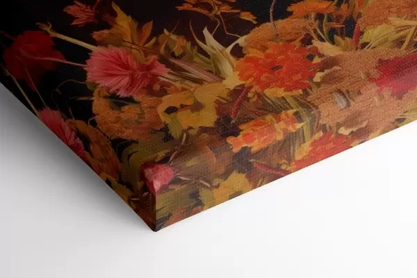 Obraz Podzimní zátiší s kyticí v teplých oranžových a červených tónech, jablky, hrozny, knihami a keramickým nádobím na tmavém pozadí. Č. s42561