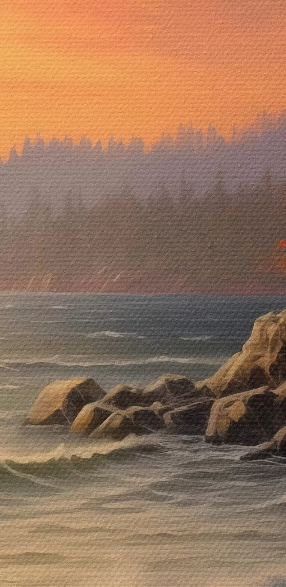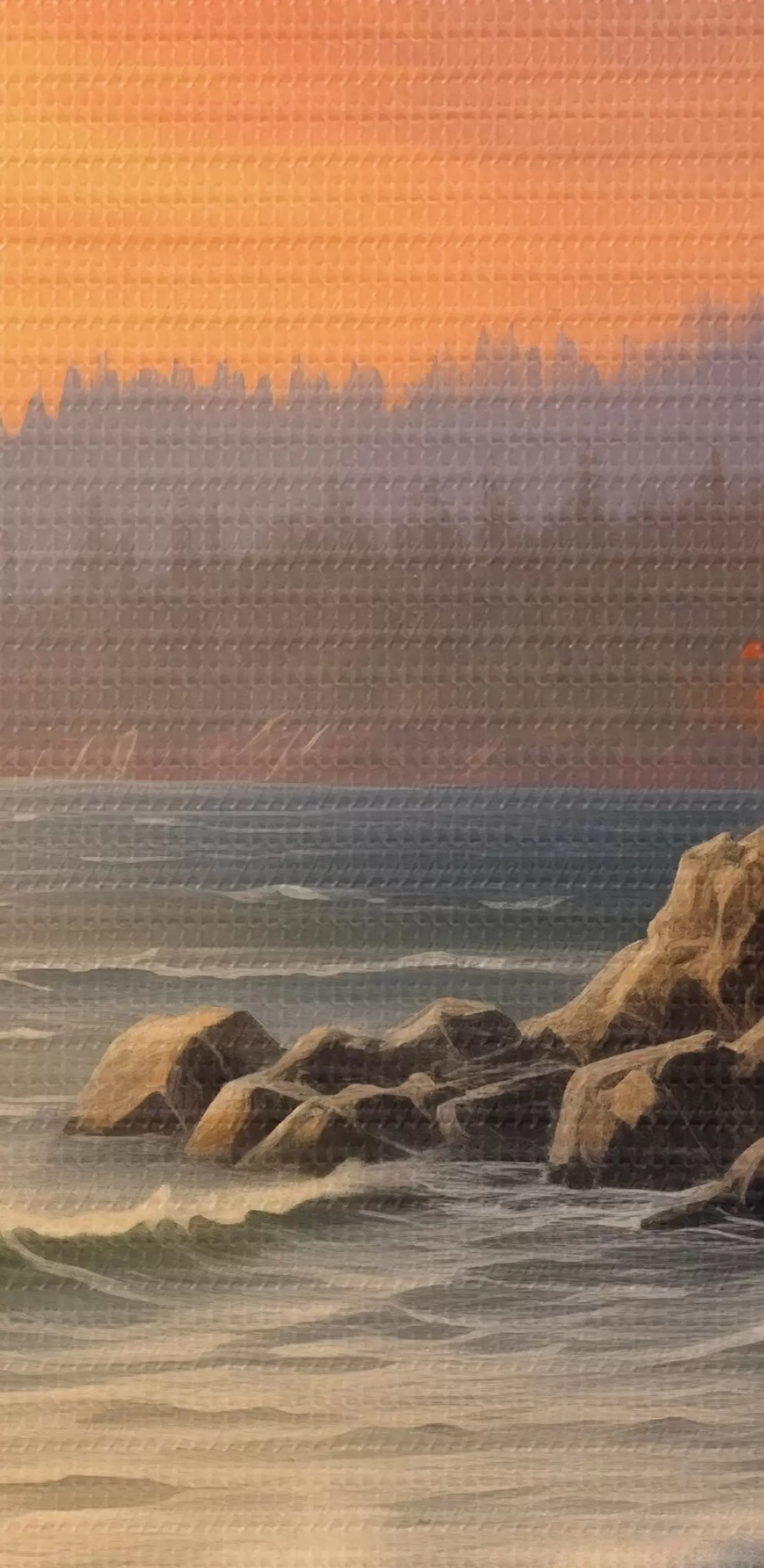 Obraz Západ slunce nad mořem s vlnami, borovým lesem a podzimními barvami v popředí. Č. s42571