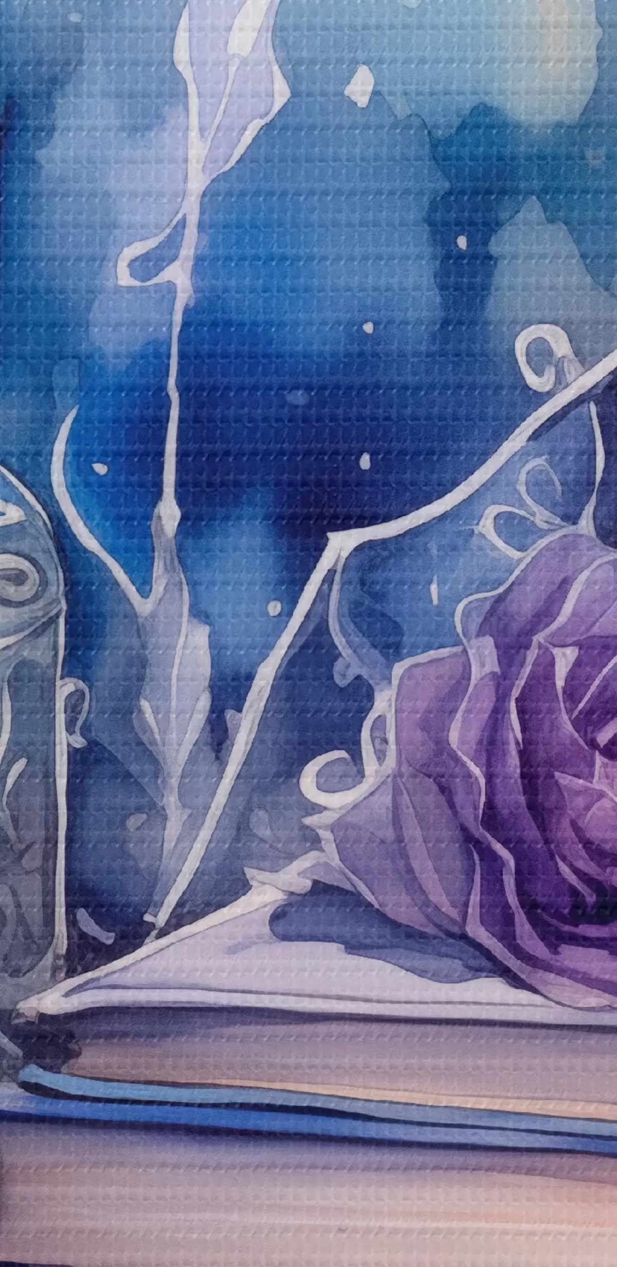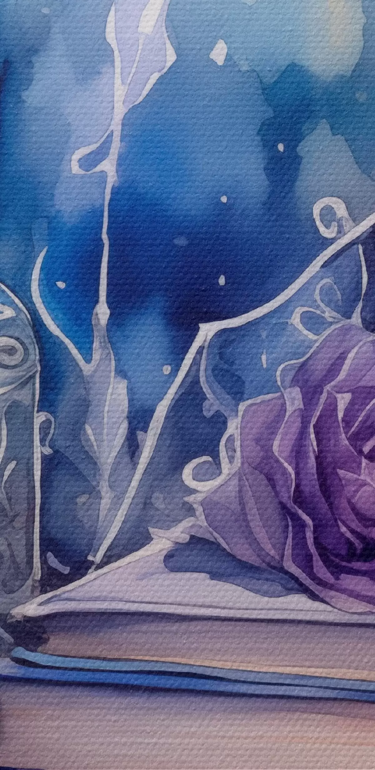 Obraz Zátiší s historickými knihami, skleněnými lahvemi v modrofialových tónech a dekorativními květinami. Č. s42574