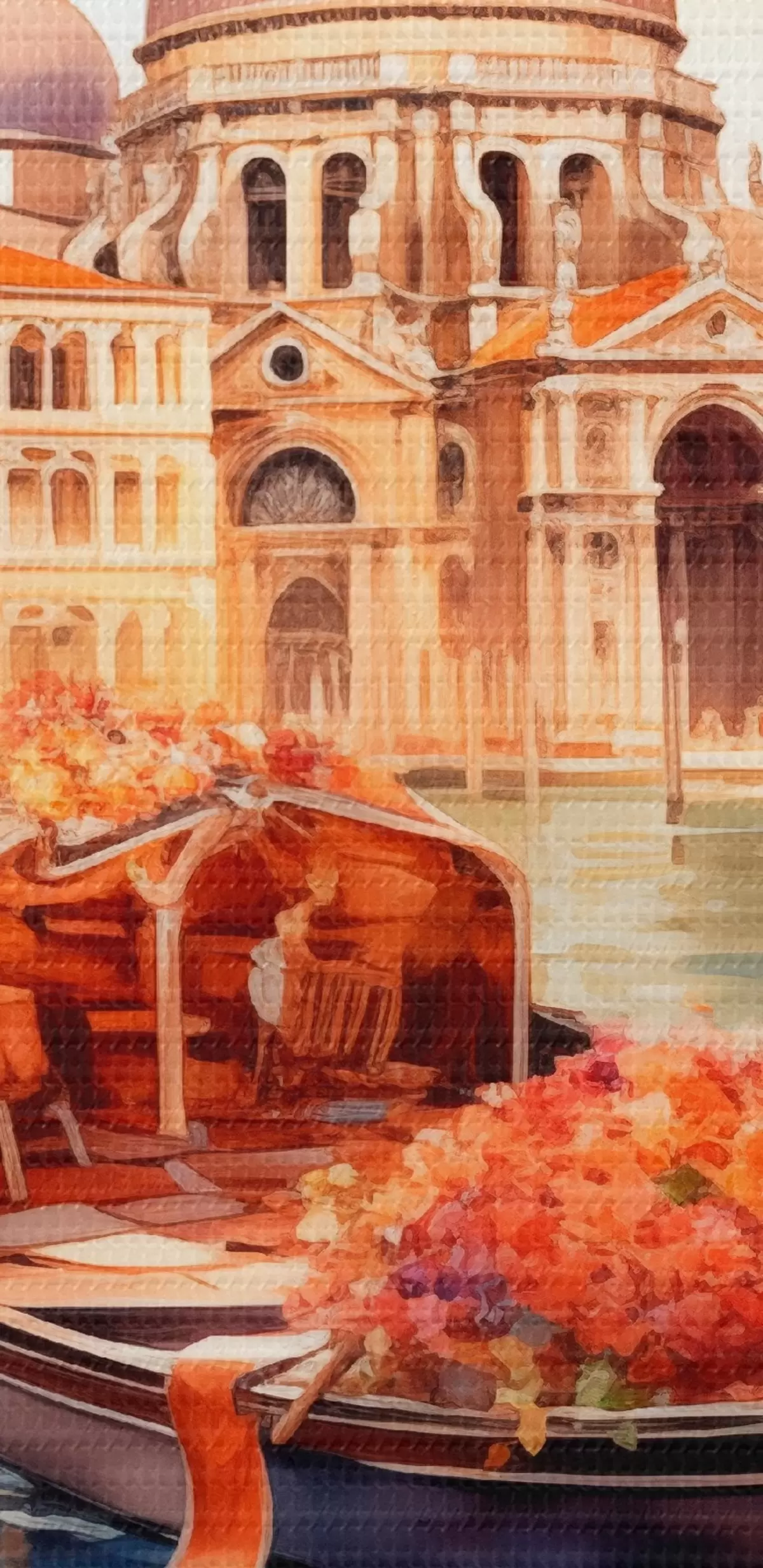 Obraz Podzimní pohled na Benátky s gondolou obklopenou zářivě oranžovým a červeným listím a s odrazy budov v klidné vodě kanálu. Č. s42576